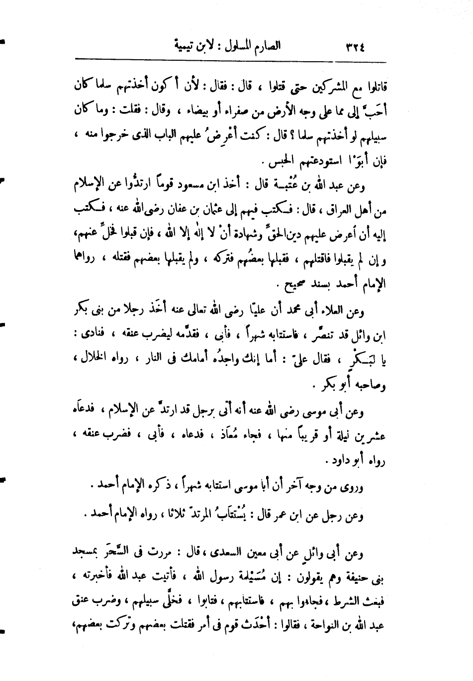 وعن العلاء أبي محمد أن عليا رضي الله عنه أخذ رجلا من بني بكر بن وائل قد تنصر فاستتابه شهرا فأبى فقدمه ليضرب عنقه فنادى: يا لبكر فقال علي: "أما إنك واجده أمامك في النار" رواه الخلال وصاحبه أبو بكر.