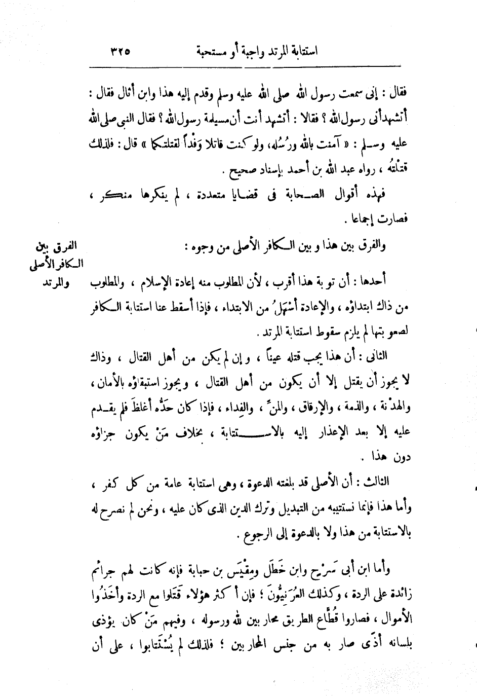 الثاني: أن هذا يجب قتله عينا وإن لم يكن من أهل القتال وذاك لا يجوز أن يقتل إلا أن يكون من أهل القتال ويجوز استبقاؤه بالأمان والهدنة والذمة والإرقاق والمن والفداء فإذا كان حده أغلظ فلم يقدم عليه إلا بعد الإعذار إليه بالاستتابة بخلاف من يكون جزاؤه دون هذا.