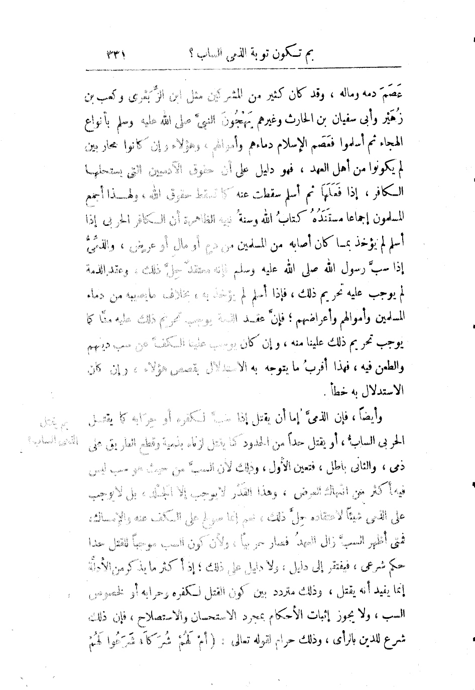 وأيضا فإن الذمي إما أن يقتل إذا سب لكفره أو حرابه كما يقتل الحربي الساب أو يقتل حدا من الحدود كما يقتل لزناه بذمية وقطع الطريق على ذمي والثاني باطل فتعين الأول وذلك لأن السب من حيث هو سب ليس فيه أكثر من انتهاك العرض وهذا القدر لا يوجب إلا الجلد بل لا يوجب على الذمي شيئا لاعتقاده حل ذلك نعم إنما صولح على الكف عنه والإمساك فمتى أظهر السب زال العهد وصار حربيا ولأن كون السب موجبا للقتل حدا حكم شرعي فيفتقر إلى دليل ولا دليل على ذلك إذا أكثر ما يذكر من الأدلة إنما يفيد أنه يقتل وذلك متردد بين كون القتل لكفره وحرابه أو لخصوص السب ولا يجوز إثبات الأحكام بمجرد الاستحسان والاستصلاح فإن ذلك شرع للدين بالرأي وذلك حرام لقوله تعالى: {أَمْ لَهُمْ شُرَكَاءُ شَرَعُوا لَهُمْ