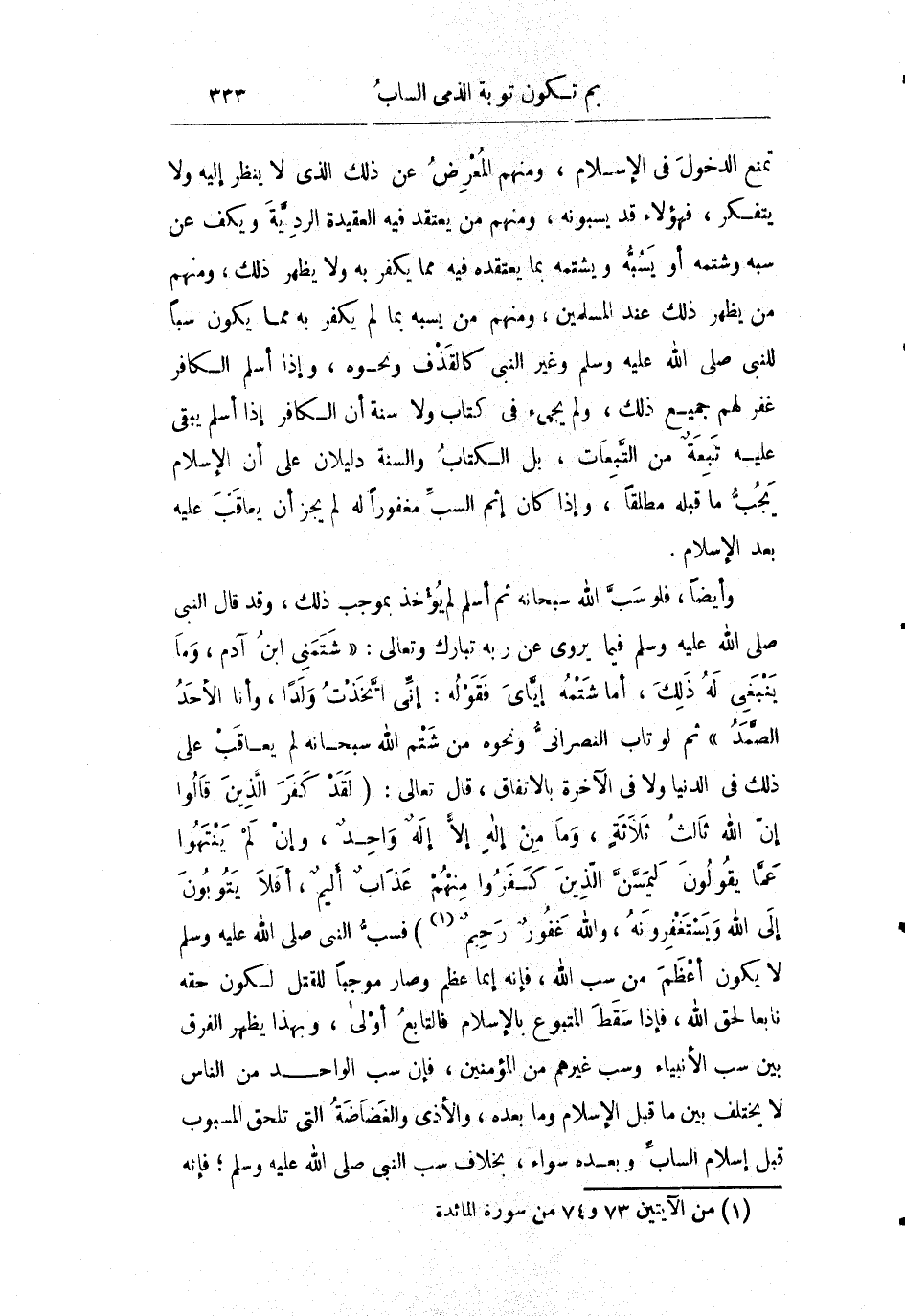 تمنع الدخول في الإسلام ومنهم المعرض عن ذلك الذي لا ينظر إليه ولا يتفكر فهؤلاء قد لا يسبونه ومنهم من يعتقد فيه العقيدة الردية ويكف عن سبه وشتمه أو يسبه ويشتمه بما يعتقده فيه مما يكفر به ولا يظهر ذلك ومنهم من يظهر ذلك عند المسلمين ومنهم من يسبه بما لم يكفر به مما يكون سبا للنبي صلى الله عليه وسلم وغير النبي كالقذف ونحوه وإذا أسلم الكفار غفر لهم جميع ذلك ولم يجئ في كتاب ولا سنة أن الكافر إذا أسلم يبقى عليه تبعة من التبعات بل الكتاب والسنة دليلان على أن الإسلام يجب ما قبله مطلقا وإذا كان إثم السب مغفورا له لم يجز أن يعاقب عليه بعد الإسلام.