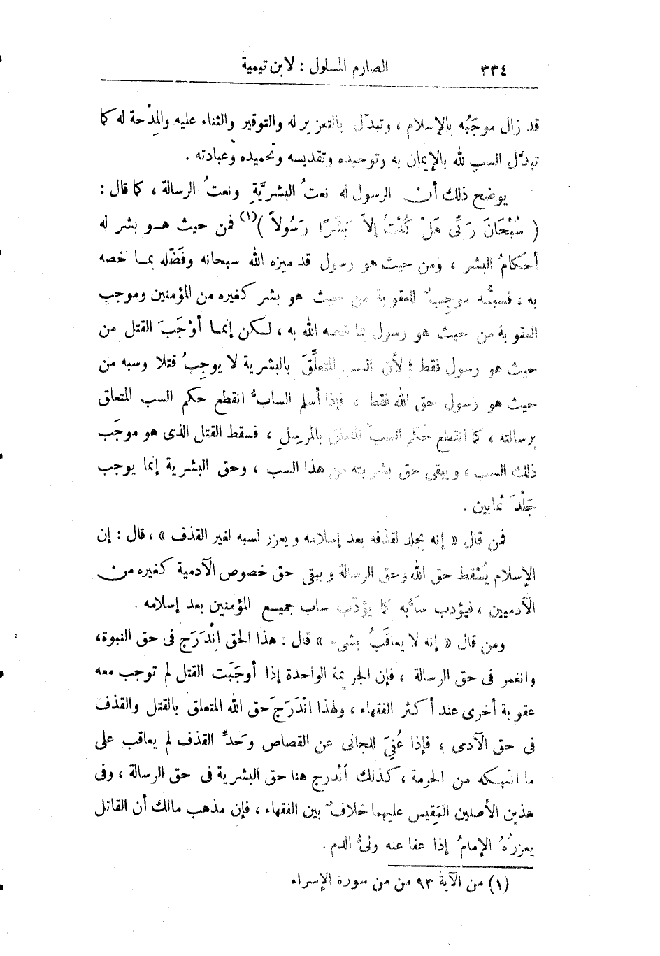 يوضح ذلك أن الرسول له نعت البشرية ونعت الرسالة كما قال: {سُبْحَانَ رَبِّي هَلْ كُنْتُ إِلَّا بَشَراً رَسُولاً} فمن حيث هو بشر له أحكام البشر ومن حيث هو رسول قد ميزه الله سبحانه وفضله بما خصه به فسبه موجب للعقوبة من حيث هو بشر كغيره من المؤمنين وموجب للعقوبة من حيث هو رسول بما خصه الله به لكن إنما أوجب القتل من حيث هو رسول فقط لأن السب المتعلق بالبشرية لا يوجب قتلا وسبه من حيث هو رسول حق لله فقط فإذا أسلم الساب انقطع حكم السب المتعلق برسالته كما انقطع حكم السب المتعلق بالمرسل فسقط القتل الذي هو موجب ذلك السب ويبقى حق بشريته من هذا السب وحق البشرية إنما يوجب جلد ثمانين.