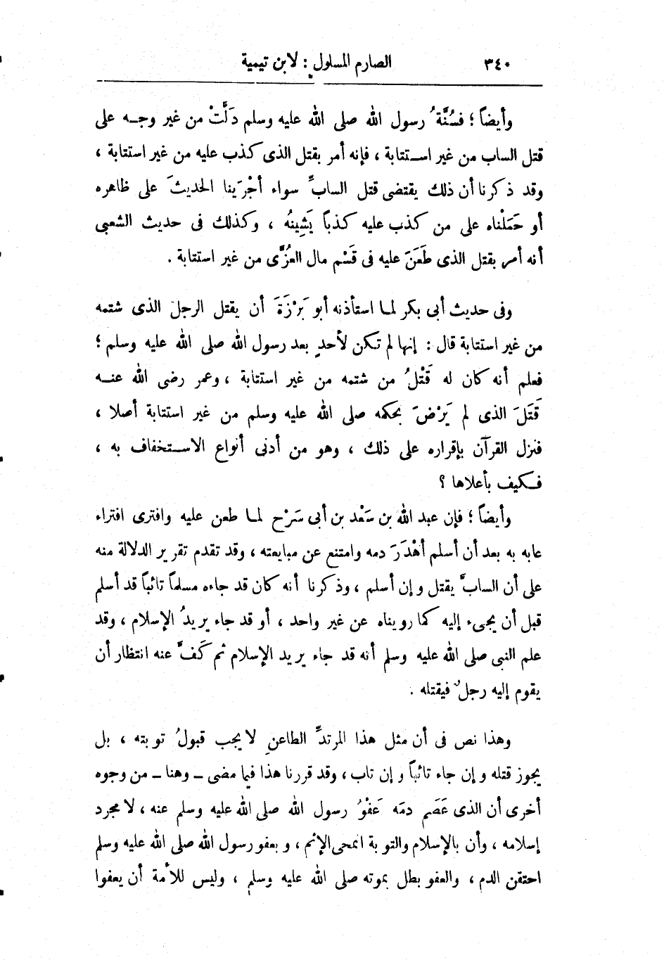 وأيضا فسنة رسول الله صلى الله عليه وسلم دلت من غير وجه على قتل الساب من غير استتابة فإنه أمر بقتل الذي كذب عليه من غير استتابة وقد ذكرنا أن ذلك يقتضي قتل الساب سواء أجرينا الحديث على ظاهره أو حملناه على من كذب عليه كذبا يشينه وكذلك في حديث الشعبي أنه أمر بقتل الذي طعن عليه في قسم مال العزى من غير استتابة.