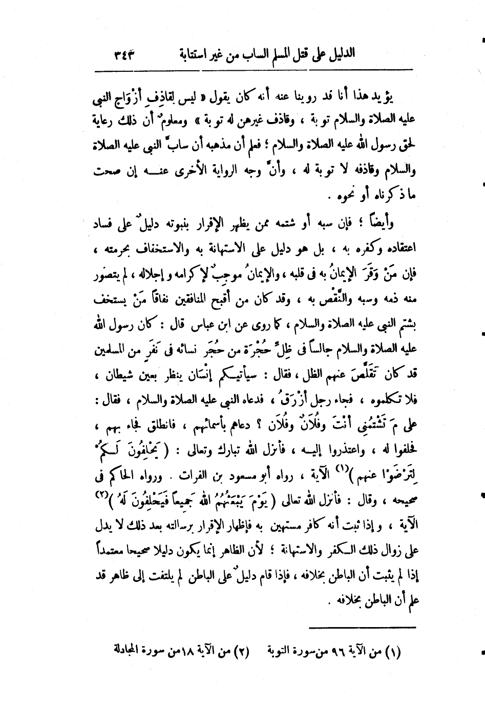 وأيضا فإن سبه أو شتمه ممن يظهر الإقرار بنبوته دليل على فساد اعتقاده وكفره به بل هو دليل على الاستهانة به والاستخفاف بحرمته فإن من وقر الإيمان في قلبه والإيمان موجب لإكرامه وإجلاله لم يتصور منه ذمه وسبه والنقص به وقد كان من أقبح المنافقين نفاقا من يستخف بشتم النبي صلى الله عليه وسلم كما روي عن ابن عباس قال: "كان رسول الله صلى الله عليه وسلم جالسا في ظل حجرة من حجر نسائه في نفر من المسلمين قد كان تقلص عنهم الظل فقال: سيأتيكم إنسان ينظر بعين شيطان فلا تكلموه فجاء رجل أزرق فدعاه النبي صلى الله عليه وسلم فقال: علام تشتمني أنت وفلان وفلان؟ دعاهم بأسمائهم فانطلق فجاء بهم فحلفوا له واعتذروا إليه فأنزل الله تبارك وتعالى: {يَحْلِفُونَ لَكُمْ لِتَرْضَوْا عَنْهُمْ} الآية رواه أبو مسعود بن الفرات ورواه الحاكم في صحيحه وقال: فأنزل الله تعالى {يَوْمَ يَبْعَثُهُمُ اللَّهُ جَمِيعاً فَيَحْلِفُونَ لَهُ} الآية وإذا ثبت أنه كافر مستهين به فإظهار الإقرار برسالته بعد ذلك لا يدل على زوال الكفر والاستهانة لأن الظاهر إنما يكون دليلا صحيحا معتمدا إذا لم يثبت أن الباطن بخلافه فإذا قام دليل على الباطن لم يلتفت إلى ظاهر قد علم أن الباطن بخلافه.