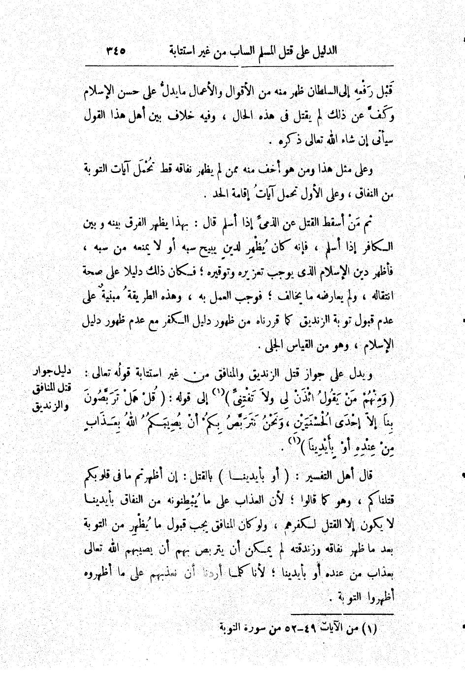 ويدل على جواز قتل الزنديق والمنافق من غير استتابة قوله وتعالى: {وَمِنْهُمْ مَنْ يَقُولُ ائْذَنْ لِي وَلا تَفْتِنِّي} إلى قوله: {قُلْ هَلْ تَرَبَّصُونَ بِنَا إِلاَّ إِحْدَى الْحُسْنَيَيْنِ وَنَحْنُ نَتَرَبَّصُ بِكُمْ أَنْ يُصِيبَكُمُ اللَّهُ بِعَذَابٍ مِنْ عِنْدِهِ أَوْ بِأَيْدِينَا} .