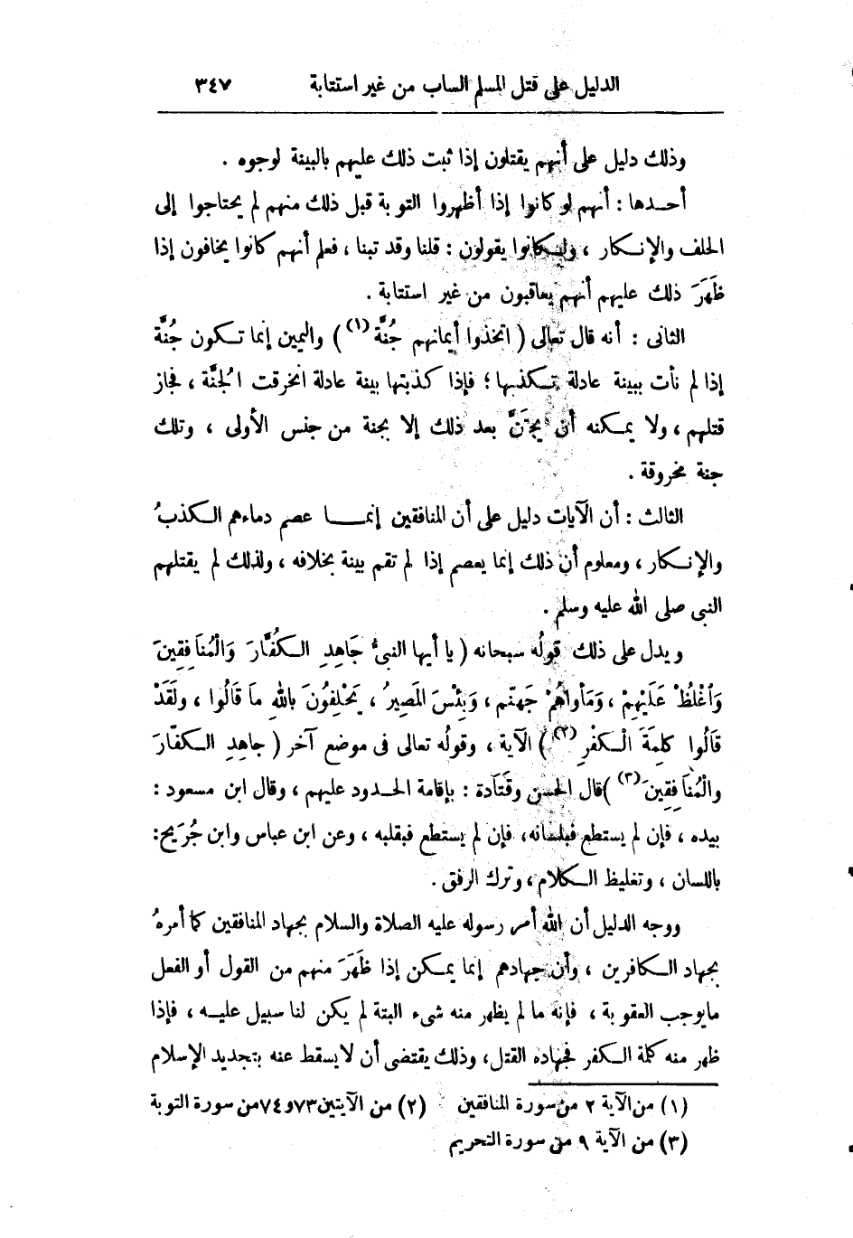 ووجه الدليل أن الله أمر رسوله عليه الصلاة والسلام بجهاد المنافقين كما أمره بجهاد الكافرين وأن جهادهم إنما يمكن إذا ظهر منهم من القول أو الفعل ما يوجب العقوبة فإنه ما لم يظهر منه شيء البتة لم يكن لنا سبيل عليه فإذا ظهر منه كلمة الكفر فجهاده القتل وذلك يقتضي أن لا يسقط عنه بتجديد الإسلام