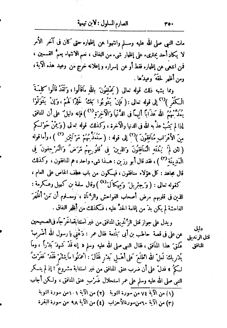 ومما يشبه ذلك قوله تعالى: {يَحْلِفُونَ بِاللَّهِ مَا قَالُوا وَلَقَدْ قَالُوا كَلِمَةَ الْكُفْرِ} إلى قوله تعالى: {فَإِنْ يَتُوبُوا يَكُ خَيْراً لَهُمْ وَإِنْ يَتَوَلَّوْا يُعَذِّبْهُمُ اللَّهُ عَذَاباً أَلِيماً فِي الدُّنْيَا وَالآخِرَةِ} فإنه دليل على أن المنافق إذا لم يتب عذبه الله في الدنيا والآخرة وكذلك قوله تعالى: {وَمِمَّنْ حَوْلَكُمْ مِنَ الأَعْرَابِ مُنَافِقُونَ} إلى قوله تعالى: {سَنُعَذِّبُهُمْ مَرَّتَيْنِ} وأما قوله: {لَئِنْ لَمْ يَنْتَهِ الْمُنَافِقُونَ وَالَّذِينَ فِي قُلُوبِهِمْ مَرَضٌ وَالْمُرْجِفُونَ فِي الْمَدِينَةِ} فقد قال أبو: "هذا شيء واحد هم المنافقون" وكذلك قال مجاهد: "كل هؤلاء منافقون فيكون من باب عطف الخاص على العام" كقوله تعالى: {وَجِبْرِيلَ وَمِيكَال} وقال سلمة بن كهيل وعكرمة: "الذين في قلوبهم مرض أصحاب الفواحش والزناة ومعلوم أن من أظهر الفاحشة لم يكن بد من إقامة الحد عليه فكذلك من أظهر النفاق".