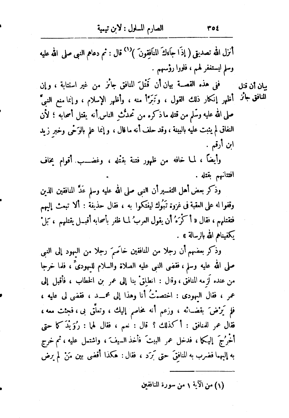 ففي هذه القصة بيان أن قتل المنافق جائز من غير استتابة وإن أظهر إنكار ذلك القول وتبرأ منه وأظهر الإسلام وإنما منع النبي صلى الله عليه وسلم من قتله ما ذكره من تحدث الناس أنه يقتل أصحابه لأن النفاق لم يثبت عليه بالبينة وقد حلف أنه ما قال وإنما علم بالوحي وخبر زيد ابن أرقم.