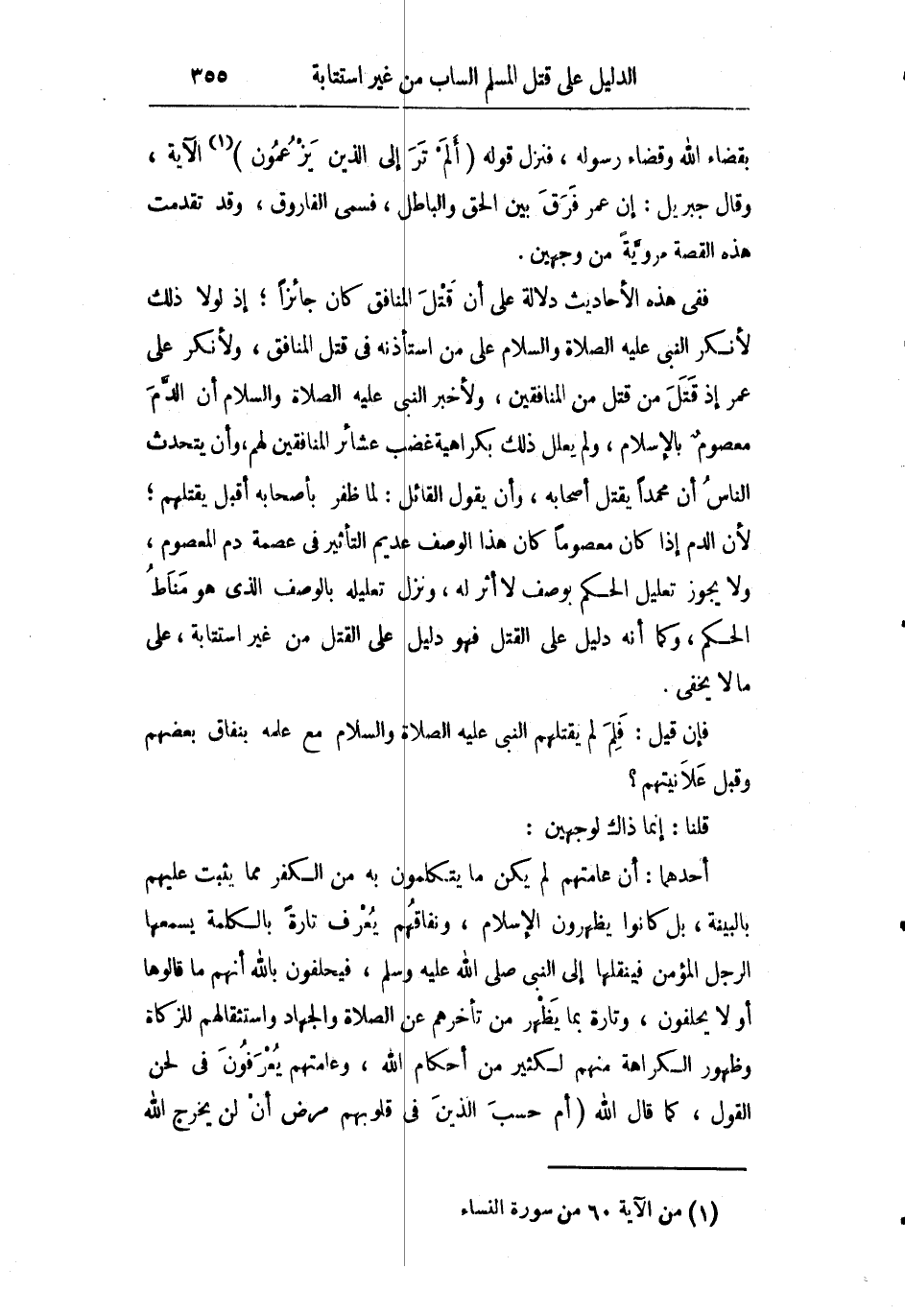 ففي هذه الأحاديث دلالة على أن قتل المنافق كان جائزا إذ لولا ذلك لأنكر النبي صلى الله عليه وسلم على من استأذنه في قتل المنافق ولأنكر على عمر إذ قتل من قتل من المنافقين ولأخبر النبي صلى الله عليه وسلم أن الدم معصوم بالإسلام ولم يعلل ذلك بكراهية غضب عشائر المنافقين لهم وإن يتحدث الناس أن محمدا يقتل أصحابه وأن يقول القائل: لما ظفر بأصحابه أقبل يقتلهم لأن الدم إذا كان معصوما كان هذا الوصف عديم التأثير في عصمة دم المعصوم ولا يجوز تعليل الحكم بوصف لا أثر له ونزل تعليله بالوصف الذي هو مناط الحكم وكما أنه دليل على القتل فهو دليل على القتل من غير استتابة على ما لا يخفى.