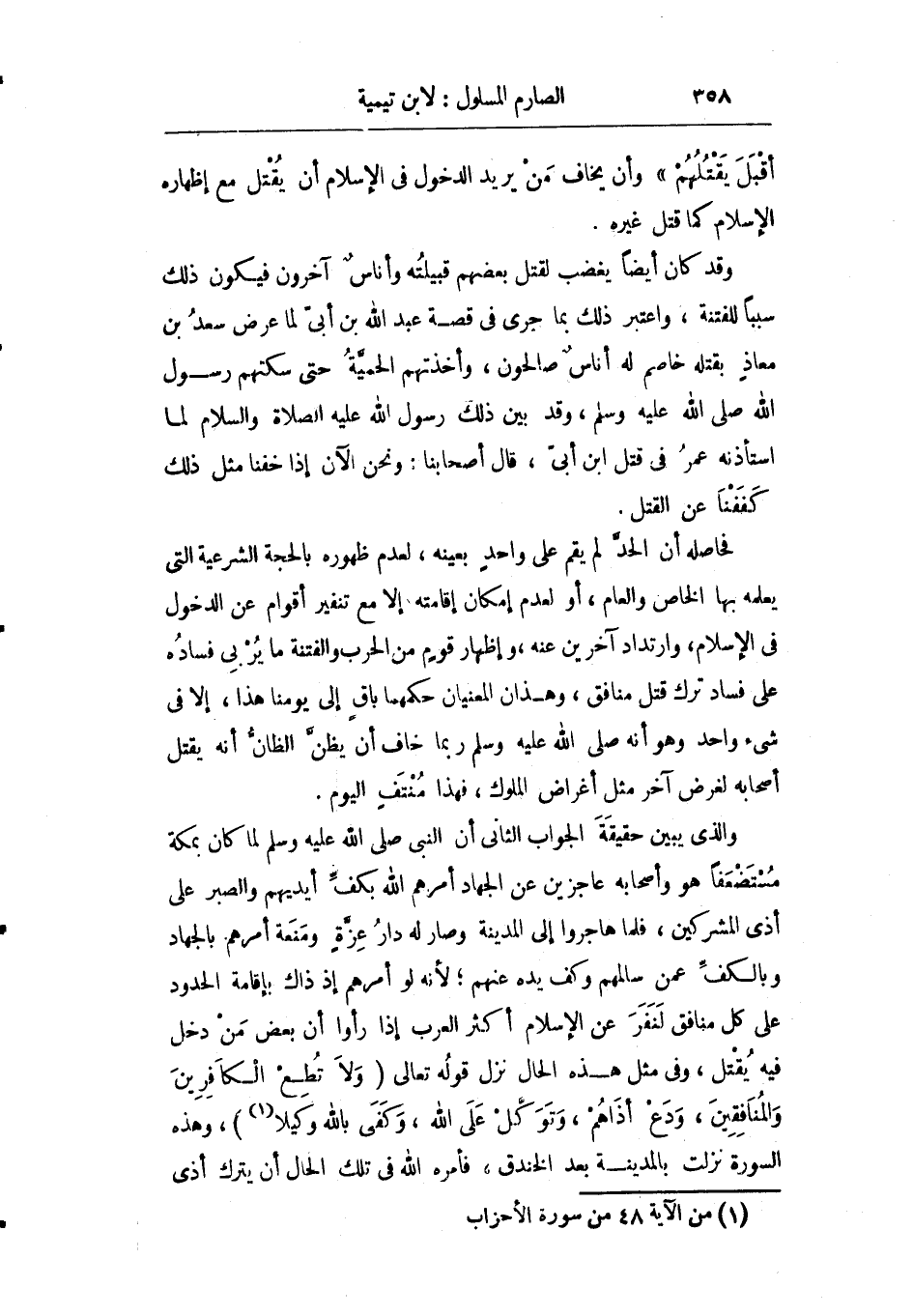والذي يبين حقيقة الجواب الثاني أن النبي صلى الله عليه وسلم لما كان بمكة مستضعفا هو وأصحابه عاجزين عن الجهاد أمرهم الله بكف أيديهم والصبر على أذى المشركين فلما هاجروا إلى المدينة وصار له دار عز ومنعة أمرهم بالجهاد وبالكف عمن سالمهم وكف يده عنهم لأنه لو أمرهم إذ ذاك بإقامة الحدود على كل منافق لنفر عن الإسلام أكثر العرب إذ رأوا أن بعض من دخل فيه يقتل وفي مثل هذه الحال نزل قوله: {وَلا تُطِعِ الْكَافِرِينَ وَالْمُنَافِقِينَ وَدَعْ أَذَاهُمْ وَتَوَكَّلْ عَلَى اللَّهِ وَكَفَى بِاللَّهِ وَكِيلاً} وهذه السورة نزلت بالمدينة بعد الخندق فأمره الله في تلك الحال أن يترك أذى