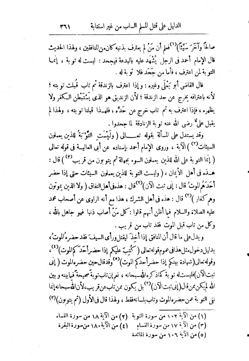 وقد يستدل على المسألة بقوله تعالى: {وَلَيْسَتِ التَّوْبَةُ لِلَّذِينَ يَعْمَلُونَ السَّيِّئَاتِ} الآية وروى الإمام أحمد بإسناده عن أبي العالية في قوله تعالى: {إِنَّمَا التَّوْبَةُ عَلَى اللَّهِ لِلَّذِينَ يَعْمَلُونَ السُّوءَ بِجَهَالَةٍ ثُمَّ يَتُوبُونَ مِنْ قَرِيبٍ} قال: "هذه في أهل الإيمان" {وَلَيْسَتِ التَّوْبَةُ لِلَّذِينَ يَعْمَلُونَ السَّيِّئَاتِ حَتَّى إِذَا حَضَرَ أَحَدَهُمُ الْمَوْتُ قَالَ إِنِّي تُبْتُ الآنَ} قال: "هذه في أهل النفاق" {وَلا الَّذِينَ يَمُوتُونَ وَهُمْ كُفَّارٌ} قال: "هذه في أهل الشرك" هذا مع أنه الراوي عن أصحاب محمد صلى الله عليه وسلم فيما أظن أنهم قالوا: "كل من أصاب ذنبا فهو جاهل بالله وكل من تاب قبل الموت فقد تاب من قريب".