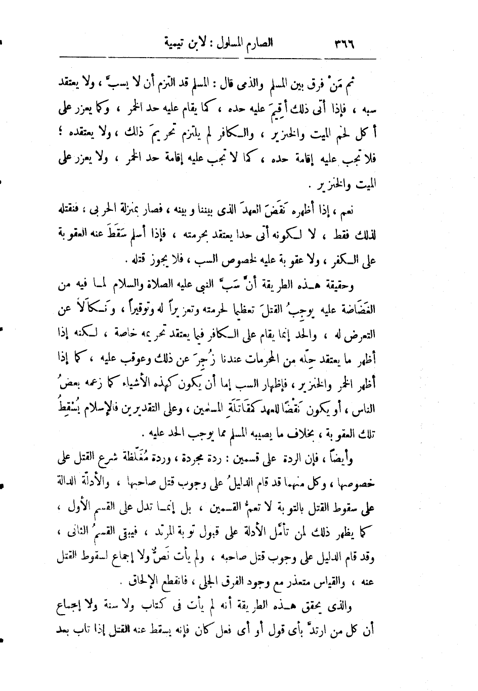 وحقيقة هذه الطريقة أن سب النبي صلى الله عليه وسلم لما فيه من الغضاضة عليه يوجب القتل تعظيما لحرمته وتعزيرا له وتوقيرا ونكالا عن التعرض له والحد إنما يقام على الكافر فيما يعتقد تحريمه خاصة لكنه إذا أظهر ما يعتقد حله من المحرمات عندنا زجر عن ذلك وعوقب عليه كما إذا أظهر الخمر والخنزير فإظهار السب إما أن يكون كهذه الأشياء كما زعمه بعض الناس أو يكون نقضا للعهد كمقاتلة المسلمين وعلى التقديرين فالإسلام يسقط تلك العقوبة بخلاف ما يصيبه المسلم مما يوجب الحد عليه.
