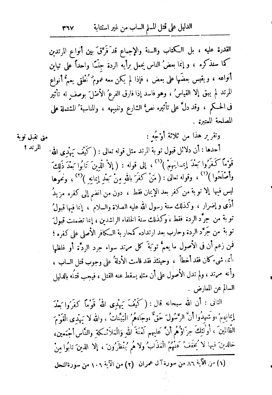 أحدها: أن دلائل قبول توبة المرتد مثل قوله تعالى: {كَيْفَ يَهْدِي اللَّهُ قَوْماً كَفَرُوا بَعْدَ إِيمَانِهِمْ} إلى قوله: {إِلاَّ الَّذِينَ تَابُوا مِنْ بَعْدِ ذَلِكَ وَأَصْلَحُوا} وقوله تعالى: {مَنْ كَفَرَ بِاللَّهِ مِنْ بَعْدِ إِيمَانِهِ} ونحوها ليس فيها إلا توبة من كفر بعد الإيمان فقط دون من انضم إلى كفره مزيد أذى وإضرار وكذلك سنة رسول الله صلى الله عليه وسلم إنما فيها قبول توبة من جرد الردة فقط وكذلك سنة الخلفاء الراشدين إنما تضمنت قبول توبة من جرد الردة وحارب بعد ارتداده كمحاربة الكافر الأصلي على كفره فمن عزم أن في الأصول ما يعم توبة كل مرتد سواء جرد الردة أو غلظها بأي شيء كان فقد أخطأ وحينئذ فقد قامت الأدلة على وجوب قتل الساب وأنه مرتد ولم تدل الأصول على أن مثله يسقط عنه القتل فيجب قتله بالدليل السالم عن المعارض.