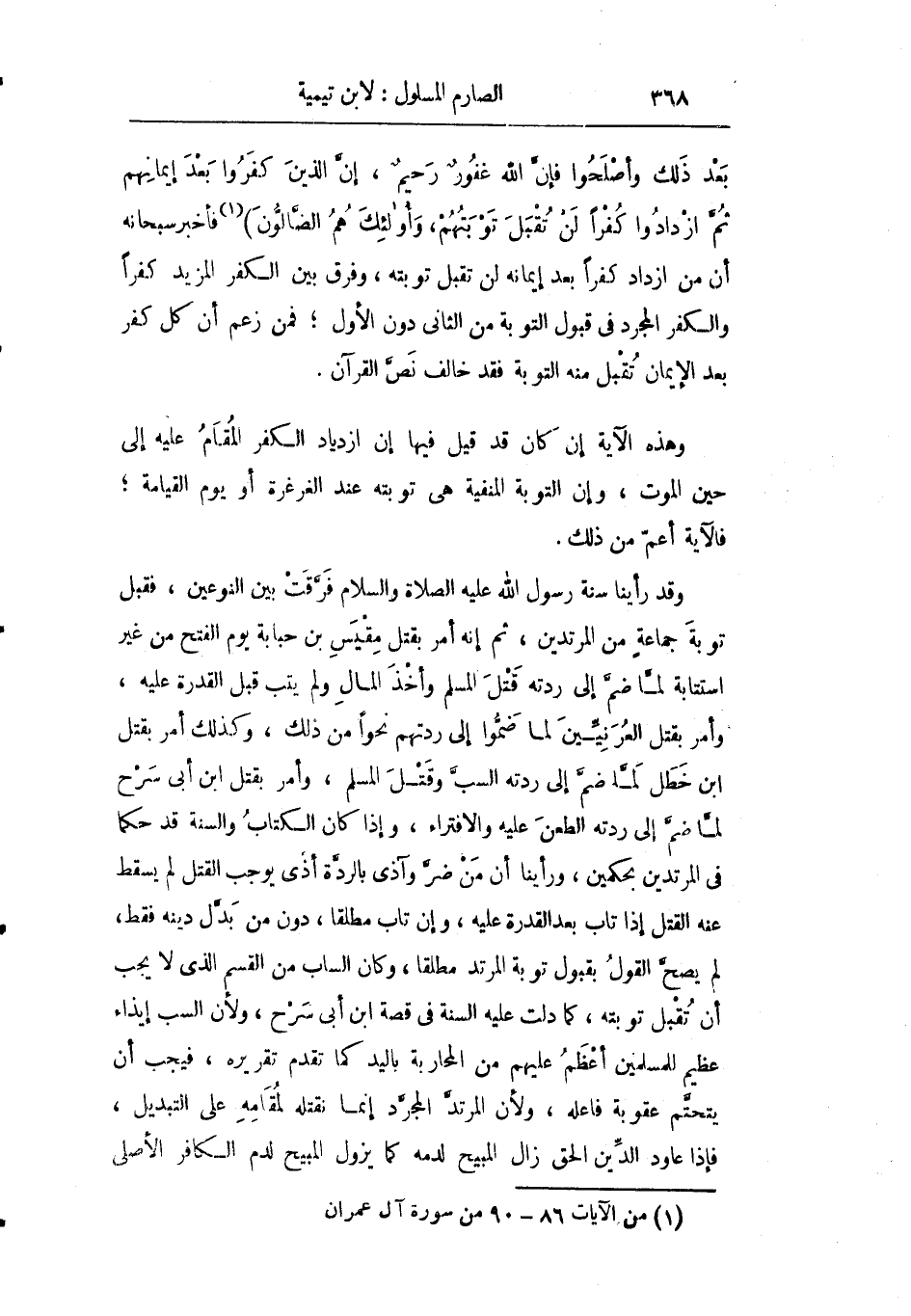 بَعْدِ ذَلِكَ وَأَصْلَحُوا فَإِنَّ اللَّهَ غَفُورٌ رَحِيمٌ إِنَّ الَّذِينَ كَفَرُوا بَعْدَ إِيمَانِهِمْ ثُمَّ ازْدَادُوا كُفْراً لَنْ تُقْبَلَ تَوْبَتُهُمْ وَأُولَئِكَ هُمُ الضَّالُّونَ} فأخبر سبحانه أن من ازداد كفرا بعد إيمانه لن تقبل توبته وفرق بين الكفر المزيد كفرا والكفر المجرد في قبول التوبة من الثاني دون الأول فمن زعم أن كل كفر بعد الإيمان تقبل منه التوبة فقد خالف نص القرآن.