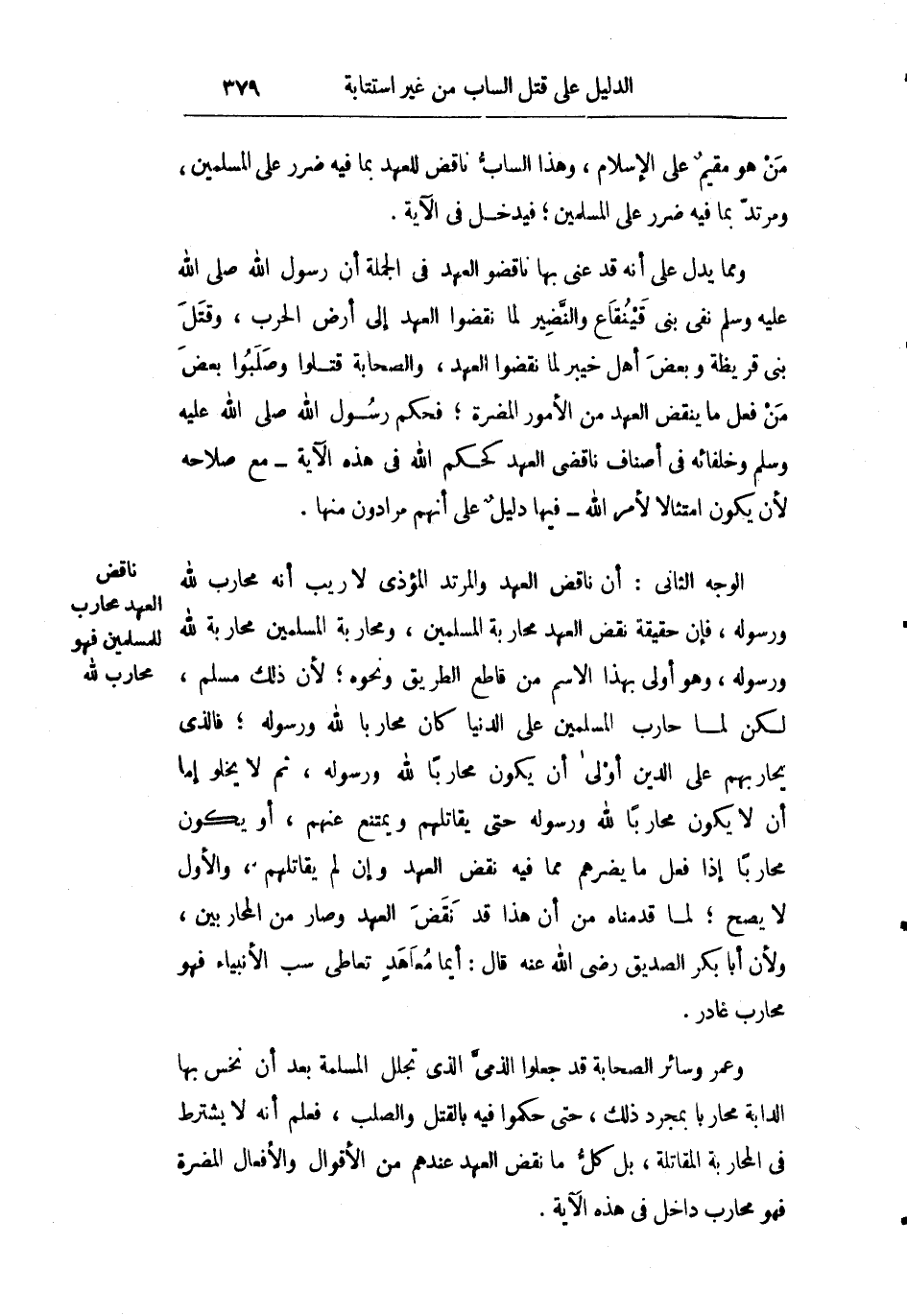 الوجه الثاني: أن ناقض العهد والمرتد المؤذي لا ريب أنه محارب لله ورسوله فإن حقيقة نقض العهد محاربة المسلمين ومحاربة المسلمين محاربة لله ورسوله وهو أولى بهذا الاسم من قاطع الطريق ونحوه لأن ذلك مسلم لكن لما حارب المسلمين على الدنيا كان محاربا لله ورسوله فالذي يحاربهم على الدين أولى أن يكون محاربا لله ورسوله ثم لا يخلو إما أن لا يكون محاربا لله ورسوله حتى يقاتلهم ويمتنع عنهم أو يكون محاربا إذا فعل ما يضرهم مما فيه نقض العهد وإن لم يقاتلهم والأول لا يصح لما قدمناه من أن هذا قد نقض العهد وصار من المحاربين ولأن أبا بكر الصديق رضي الله عنه قال: أيما معاهد تعاطى سب الأنبياء فهو محارب غادر.