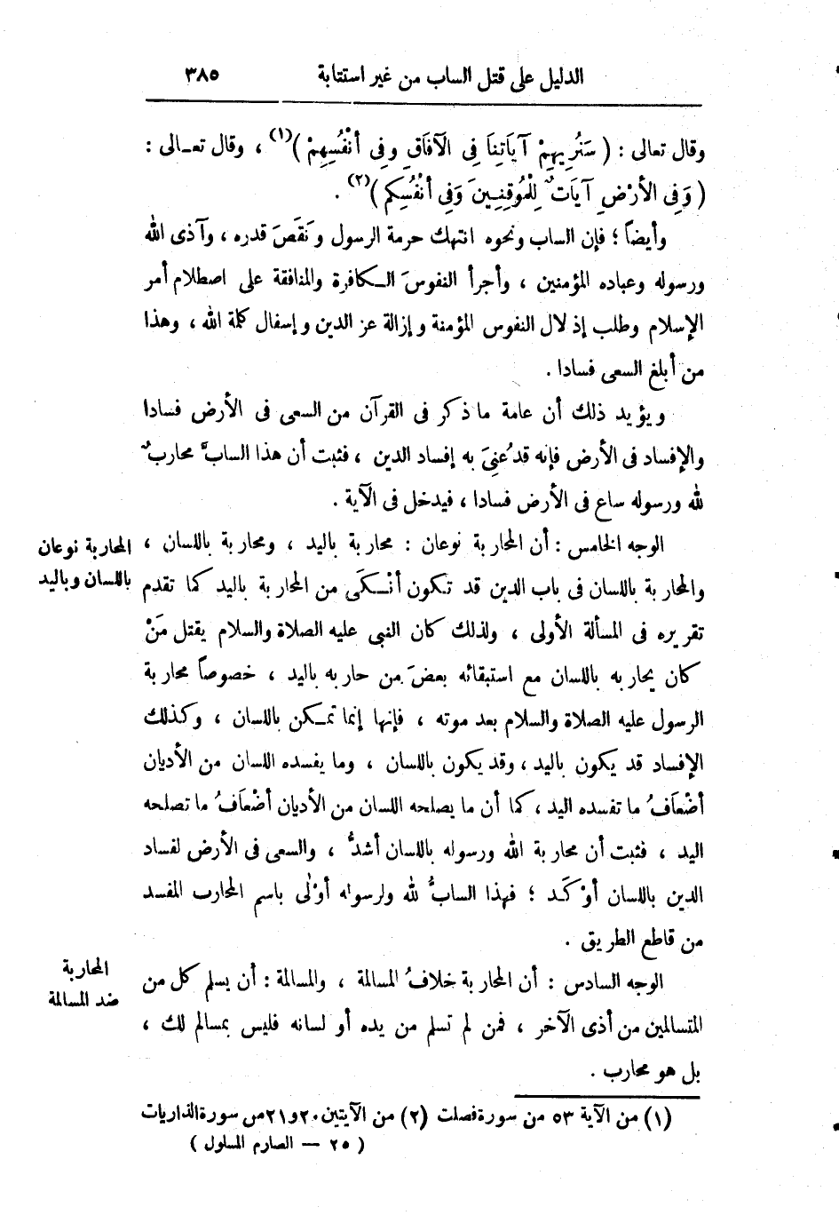 الوجه الخامس: أن المحاربة نوعان: محاربة باليد ومحاربة باللسان والمحاربة باللسان في باب الدين قد تكون أنكى من المحاربة باليد كما تقدم تقريره في المسألة الأولى ولذلك كان النبي صلى الله عليه وسلم يقتل من كان يحاربه باللسان مع استبقائه بعض من حاربه باليد خصوصا محاربة الرسول صلى الله عليه وسلم بعد موته فإنها إنما تمكن باللسان وكذلك الإفساد قد يكون باليد وقد يكون باللسان وما يفسده اللسان من الأديان أضعاف ما تفسده اليد كما أن ما يصلحه اللسان من الأديان أضعاف ما تصلحه اليد فثبت أن محاربة الله ورسوله باللسان أشد والسعي في الأرض لفساد الدين باللسان أوكد فهذا الساب لله ورسوله أولى باسم المحارب المفسد من قاطع الطريق.