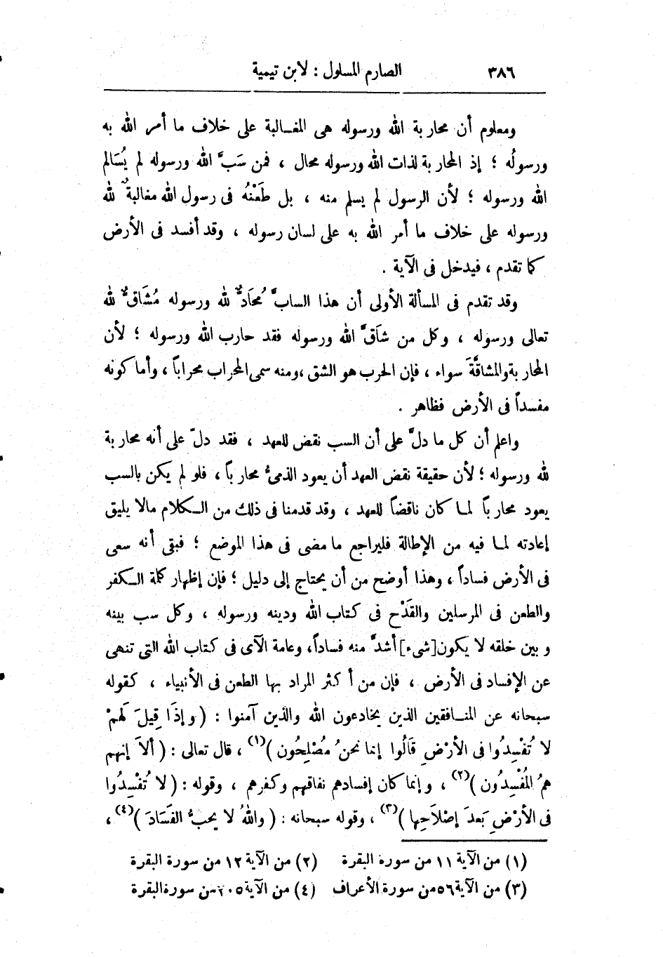 واعلم أن كل ما دل على أن السب نقض للعهد فقد دلل على أنه محاربة لله ورسوله لأن حقيقة نقض العهد أن يعود الذمي محاربا فلو لم يكن بالسب يعود محاربا لما كان ناقضا للعهد وقد قدمنا في ذلك من الكلام ما لا يليق إعادته لما فيه من الإطالة فليراجع ما مضى في هذا الموضوع فبقى أنه سعى في الأرض فسادا وهذا أوضح من أن يحتاج إلى دليل فإن إظهار كلمة الكفر والطعن في المرسلين والقدح في كتاب الله ودينه ورسله وكل سبب بينه وبين خلقه لا يكون شيء أشد منه فسادا وعامة الآي في كتاب الله التي تنهى عن الإفساد في الأرض فإن من أكثر المراد بها الطعن في الأنبياء كقوله سبحانه عن المنافقين الذين يخادعون الله والذين آمنوا: {وَإِذَا قِيلَ لَهُمْ لا تُفْسِدُوا فِي الأَرْضِ قَالُوا إِنَّمَا نَحْنُ مُصْلِحُونَ} قال تعالى: {أَلا إِنَّهُمْ هُمُ الْمُفْسِدُونَ} وإنما كان إفسادهم نفاقهم وكفرهم وقوله: {وَلا تُفْسِدُوا فِي الأَرْضِ بَعْدَ إِصْلاحِهَا} وقوله سبحانه: {وَاللَّهُ لا يُحِبُّ الْفَسَادَ}