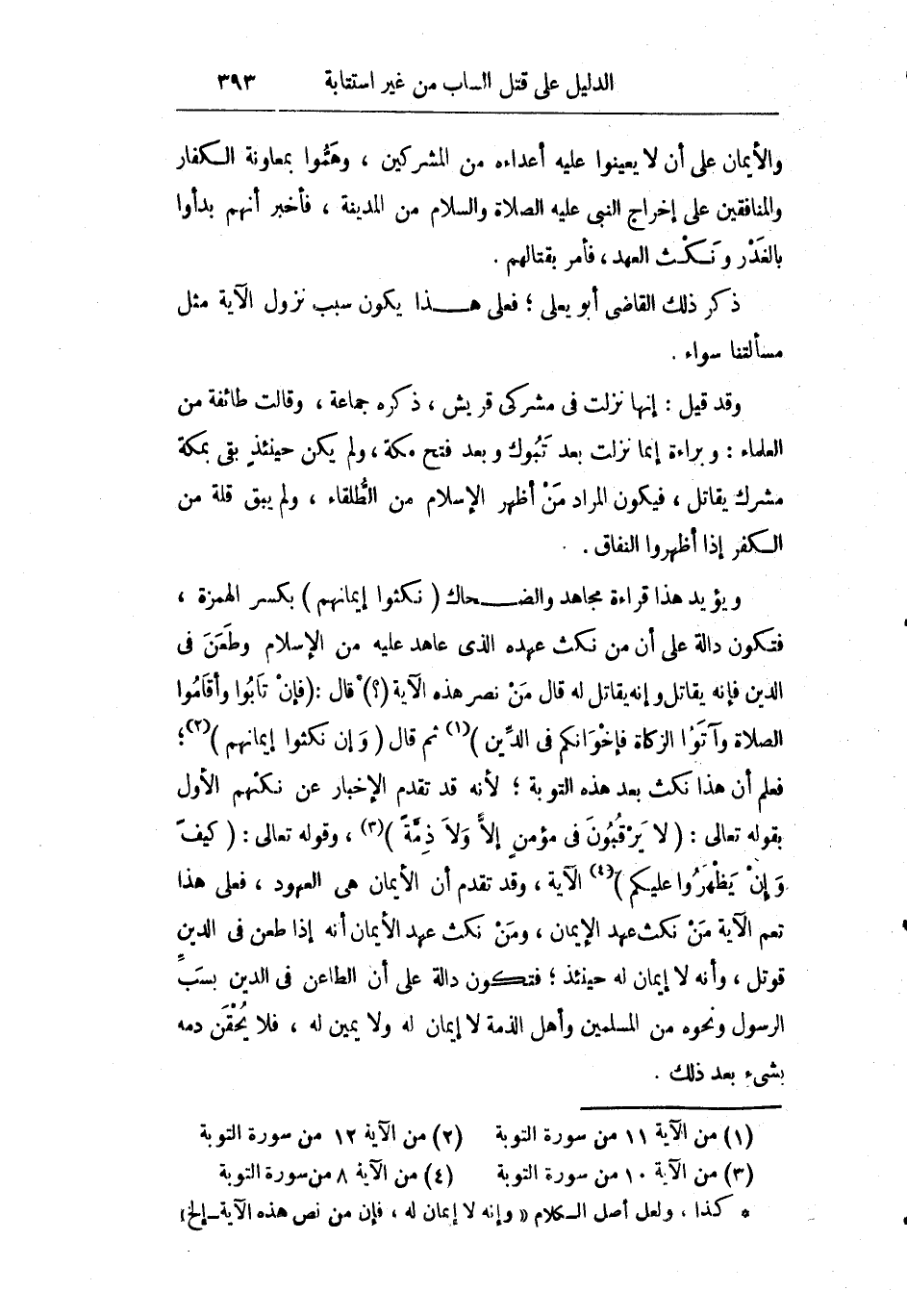 ويؤيد هذا قراءة مجاهد والضحاك: {نكثوا إيمانهم} بكسر الهمزة فتكون دالة على أن من نكث عهده الذي عاهد عليه من الإسلام وطعن في الدين فإنه يقاتل وإنه لا إيمان له قال من نصر هذا لأنه قال: {فَإِنْ تَابُوا وَأَقَامُوا الصَّلاةَ وَآتَوُا الزَّكَاةَ فَإِخْوَانُكُمْ فِي الدِّينِ} ثم قال: {وَإِنْ نَكَثُوا إيمانهم} فعلم أن هذا نكث بعد هذه التوبة لأنه قد تقدم الإخبار عن نكثهم الأول بقوله تعالى: {لا يَرْقُبُونَ فِي مُؤْمِنٍ إِلّاً وَلا ذِمَّةً} وقوله تعالى: {كَيْفَ وَإِنْ يَظْهَرُوا عَلَيْكُمْ} الآية وقد تقدم أن الأيمان من العهود فعلى هذا تعم الآية من نكث عهد الإيمان ومن نكث عهد الأيمان أنه إذا طعن في الدين قوتل وأنه لا إيمان له حينئذ فتكون دالة على أن الطاعن في الدين بسب الرسول ونحوه من المسلمين وأهل الذمة لا إيمان له ولا يمين له فلا يحقن دمه بشيء بعد ذلك.