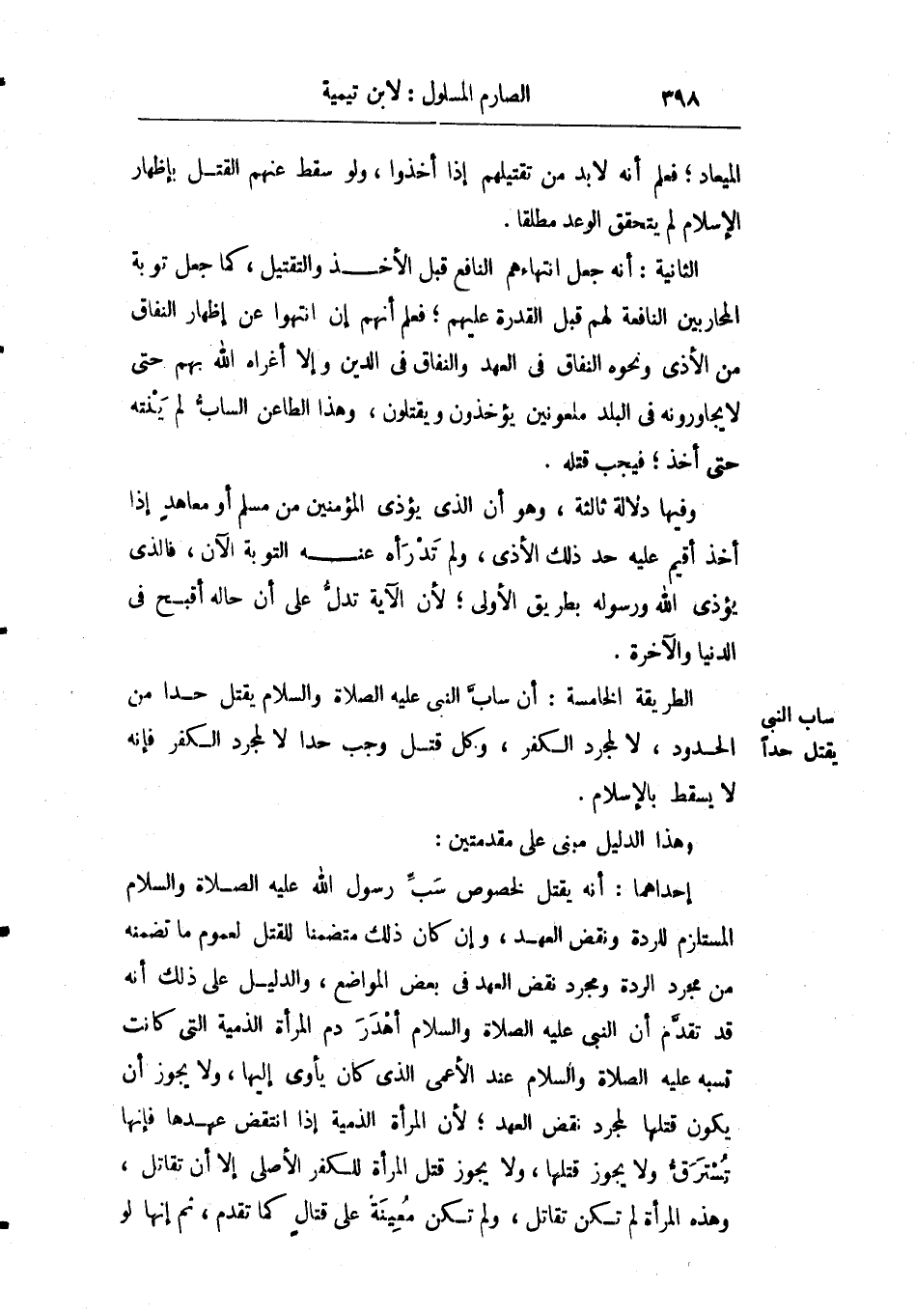 إحداهما: أنه يقتل لخصوص سب رسول الله صلى الله عليه وسلم المستلزم للردة ونقض العهد وإن كان ذلك متضمنا للقتل لعموم ما تضمنه من مجرد الردة ومجرد نقض العهد في بعض المواضع والدليل على ذلك أنه قد تقدم أن النبي صلى الله عليه وسلم أهدر دم المرأة الذمية التي كانت تسبه صلى الله عليه وسلم عند الأعمى الذي كان يأوي إليها ولا يجوز أن يكون قتلها لمجرد نقض العهد لأن المرأة الذمية إذا انتقض عهدها فإنها تسترق ولا يجوز قتلها ولا يجوز قتل المرأة للكفر الأصلي إلا أن تقاتل وهذه المرأة لم تكن تقاتل ولم تكن معينة على قتال كما تقدم ثم إنها لو