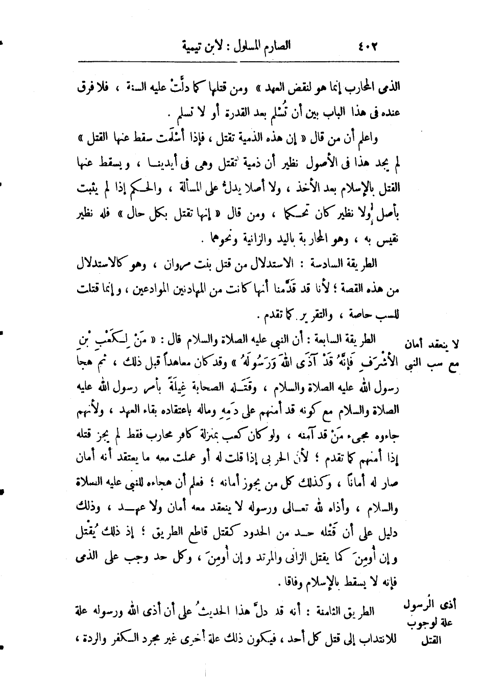 الطريقة السادسة: الاستدلال من قتل بنت مروان وهو كالاستدلال من هذه القصة لأنا قد قدمنا أنها كانت من المهادنين الموادعين وإنما قتلت للسب خاصة والتقرير كما تقدم.