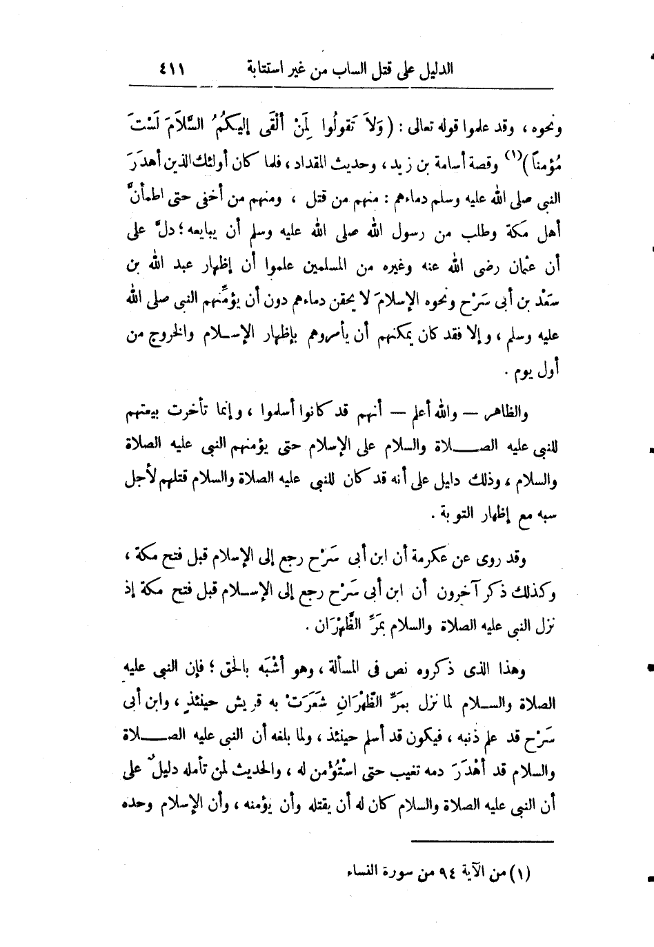 ونحوه وقد علموا قوله تعالى: {وَلا تَقُولُوا لِمَنْ أَلْقَى إِلَيْكُمُ السَّلامَ لَسْتَ مُؤْمِناً} وقصة أسامة بن زيد وحديث المقداد فلما كان أولئك الذين أهدر النبي صلى الله عليه وسلم دماءهم: منهم من قتل ومنهم من أخفي حتى اطمأن أهل مكة وطلب من رسول الله صلى الله عليه وسلم أن يبايعه دل على أن عثمان رضي الله عنه وغيره من المسلمين علموا أن إظهار عبد الله ابن سعد بن أبي سرح ونحوه الإسلام لا يحقن دماءهم دون أن يؤمنهم النبي صلى الله عليه وسلم وإلا فقد كان يمكنهم أن يأمروهم بإظهار الإسلام والخروج من أول يوم.