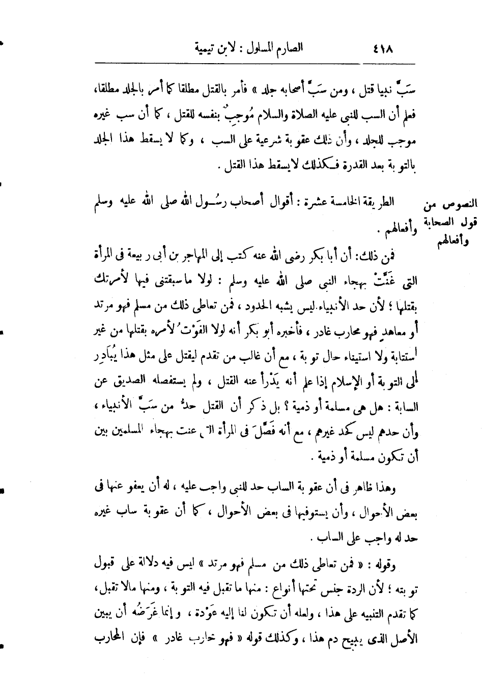 سب نبيا قتل ومن سب أصحابه جلد" فأمر بالقتل مطلقا كما أمر بالجلد مطلقا فعلم أن السب للنبي عليه الصلاة والسلام موجب بنفسه للقتل كما أن سب غيره موجب للجلد وأن ذلك عقوبة شرعية على السب وكما لا يسقط هذا الجلد بالتوبة بعد القدرة فكذلك لا يسقط هذا القتل.