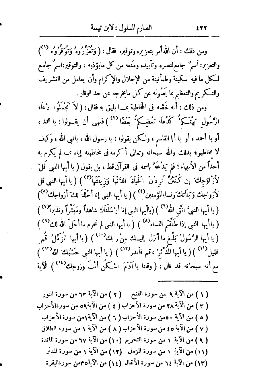 ومن ذلك: أن الله أمر بتعزيره وتوقيره فقال: {وَتُعَزِّرُوهُ وَتُوَقِّرُوهُ} والتعزير: اسم جامع لنصره وتأييده ومنعه من كل ما يؤذيه والتوقير: اسم جامع لكل ما فيه سكينة وطمأنينة من الإجلال والإكرام وأن يعامل من التشريف والتكريم والتعظيم بما يصونه عن كل ما يخرجه عن حد الوقار.