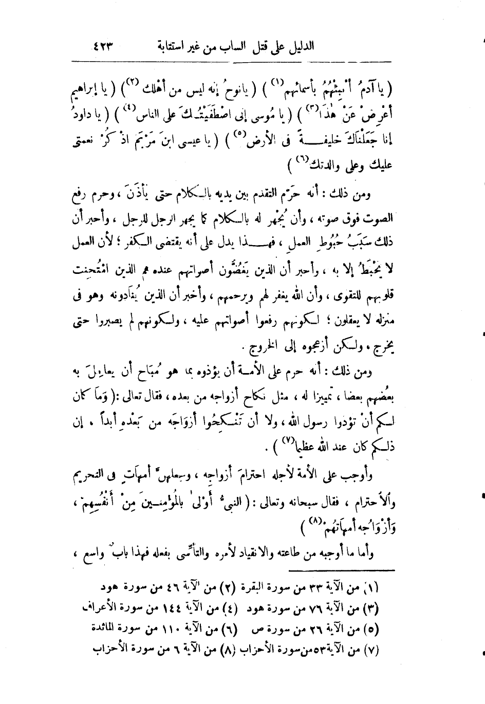 ومن ذلك: أنه حرم التقدم بين يديه بالكلام حتى يأذن وحرم رفع الصوت فوق صوته وأن يجهر له بالكلام كما يجهر الرجل للرجل وأخبر أن ذلك سبب حبوط العمل فهذا يدل على أنه قد يقتضي الكفر لأن العمل لا يحبط إلا به وأخبر أن الذين يغضون أصواتهم عنده هم الذين امتحنت قلوبهم للتقوى وأن الله يغفر لهم ويرحمهم وأخبر أن الذين ينادونه وهو في منزله لا يعقلون لكونهم رفعوا أصواتهم عليه ولكونهم لم يصبروا حتى يخرج ولكن أزعجوه إلى الخروج.