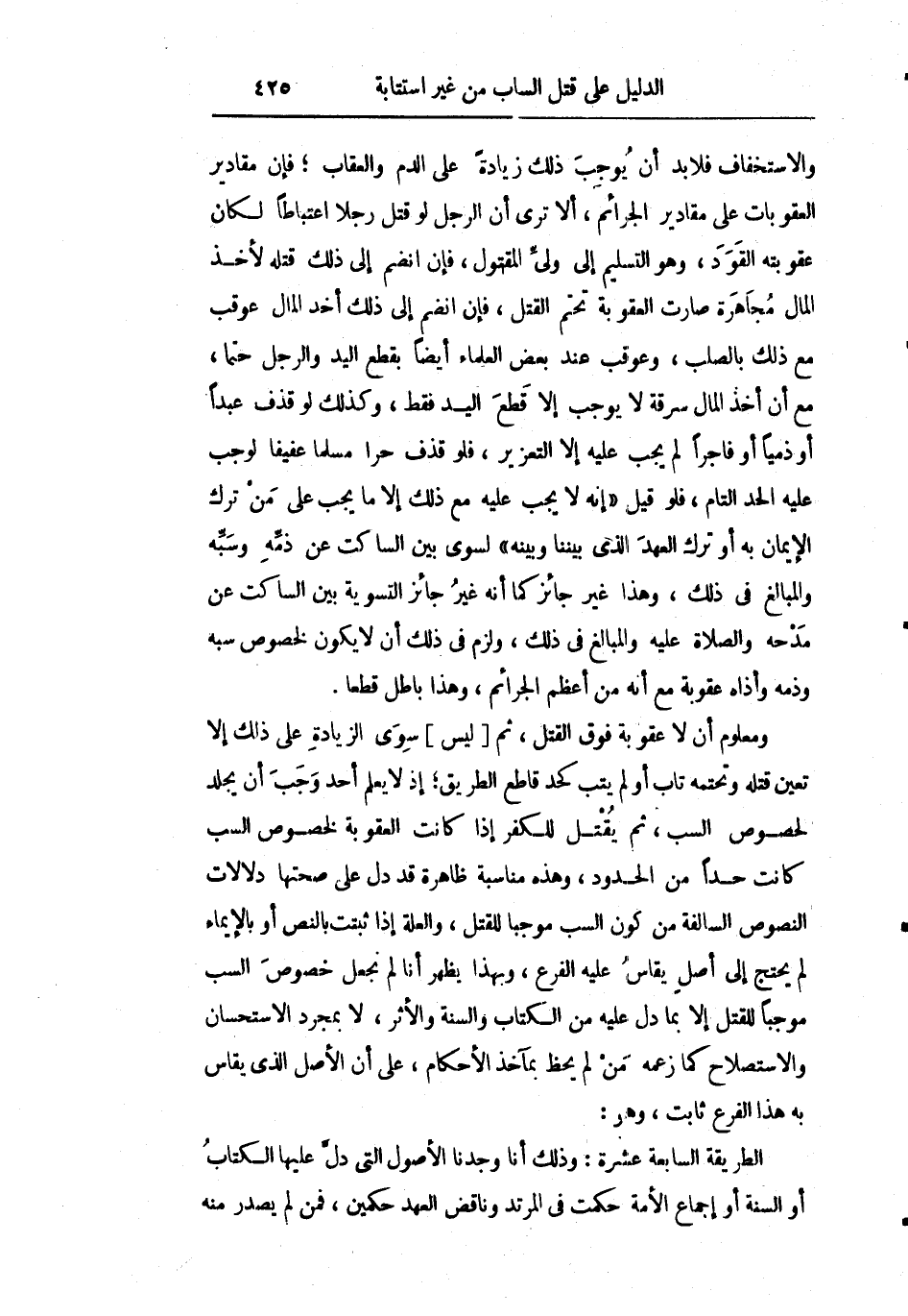 ومعلوم أن لا عقوبة فوق القتل ثم ليس سوى الزيادة على ذلك إلا تعين قتله وتحتمه تاب أو لم يتب كحد قاطع الطريق إذ لا يعلم أحد وجب أن يجلد لخصوص السب ثم يقتل للكفر إذا كانت العقوبة لخصوص السب كانت حدا من الحدود وهذه مناسبة ظاهرة قد دل على صحتها دلالات النصوص السالفة من كون السب موجبا للقتل والعلة إذا ثبت بالنص أو بالإيماء لم يحتج إلى أصل يقاس عليه الفرع وبهذا يظهر أنا لم نجعل خصوص السب موجبا للقتل إلا بما دل عليه من الكتاب والسنة والأثر لا بمجرد الاستحسان والاستصلاح كما زعمه من لم يحظ بمآخذ الأحكام على أن الأصل الذي يقاس به هذا الفرع ثابت وهو: