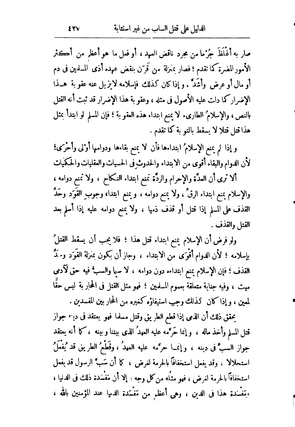 يحقق ذلك أن الذمي إذا قطع الطريق وقتل مسلما فهو يعتقد في دينه جواز قتل المسلم وأخذ ماله وإنما حرمه عليه العهد الذي بيننا وبينه كما أنه يعتقد جواز السب في دينه وإنما حرمه عليه العهد وقطع الطريق قد يفعل استحلالا وقد يفعل استخفافا بالحرمة لغرض كما أن سب الرسول قد يفعل استخفافا بالحرمة لغرض فهو مثله من كل وجه إلا أن مفسدة ذلك في الدنيا ومفسدة هذا في الدين وهي أعظم من مفسدة الدنيا عند المؤمنين بالله