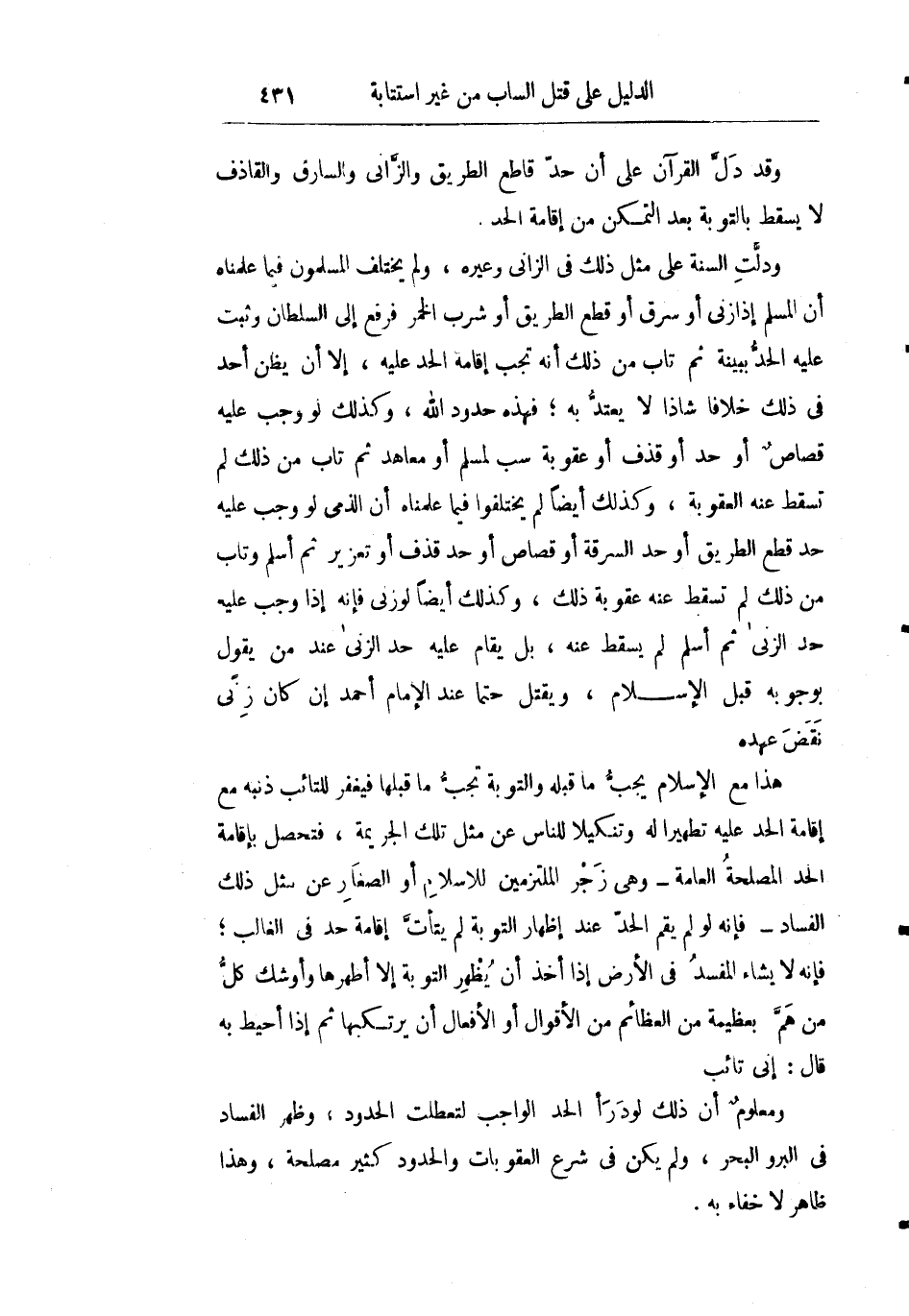 ودلت السنة على مثل ذلك في الزاني وغيره ولم يختلف المسلمون فيما علمناه أن المسلم إذا زنى أو سرق أو قطع الطريق أو شرب الخمر فرفع إلى السلطان وثبت عليه الحد ببينة ثم تاب من ذلك أنه تجب إقامة الحد عليه إلا أن يظن أحد في ذلك خلافا شاذا لا يعتد به فهذه حدود الله وكذلك لو وجب عليه قصاص أو حد أو قذف أو عقوبة سب لمسلم أو معاهد ثم تاب من ذلك لم تسقط عنه العقوبة وكذلك أيضا لم يختلفوا فيما علمناه أن الذمي لو وجب عليه حد قطع الطريق أو حد السرقة أو قصاص أو حد قذف أو تعزير ثم أسلم وتاب من ذلك لم تسقط عنه عقوبة ذلك وكذلك أيضا لو زنى فإنه إذا وجب عليه حد الزنا ثم أسلم لم يسقط عنه بل يقام عليه حد الزنا عند من يقول بوجوبه قبل الإسلام ويقتل حتما عند الإمام أحمد إن كان زنى نقض عهده.
