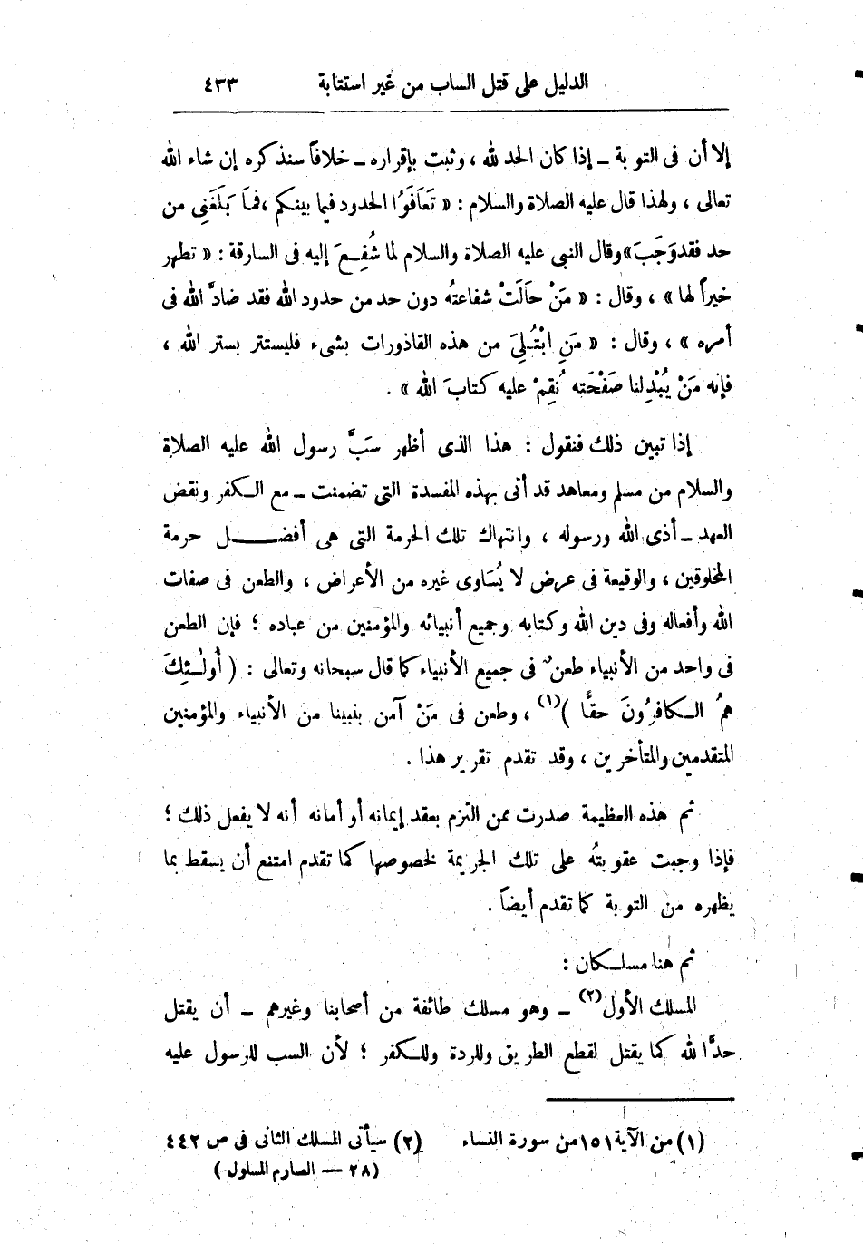 المسلك الأول: وهو مسلك طائفة من أصحابنا وغيرهم أن يقتل حدا لله كما يقتل لقطع الطريق وللردة وللكفر لأن السب للرسول عليه