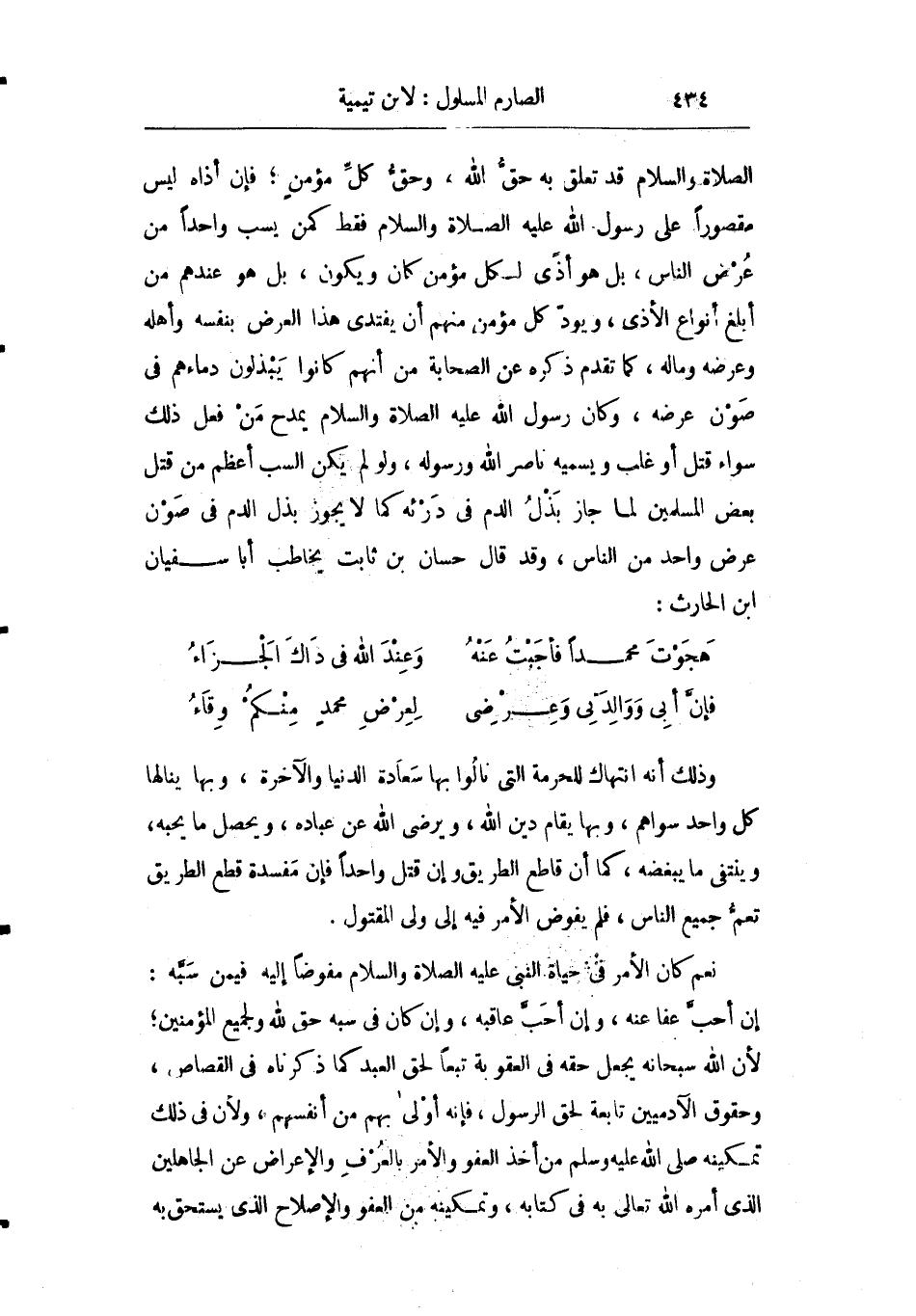 الصلاة والسلام قد تعلق به حق الله وحق كل مؤمن فإن أذاه ليس مقصورا على رسول الله صلى الله عليه وسلم فقط كمن سب واحدا من عرض الناس بل هو أذى لكل مؤمن كان ويكون بل هو عندهم من أبلغ أنواع الأذى ويود كل منهم أن يفتدي هذا العرض بنفسه وأهله وماله وعرضه كما تقدم ذكره عن الصحابة من أنهم كانوا يبذلون دماءهم في صون عرضه وكان رسول الله صلى الله عليه وسلم يمدح من فعل ذلك سواء قتل أو غلب ويسميه ناصر الله ورسوله ولو لم يكن السب أعظم من قتل بعض المسلمين لما جاز بذل الدم في صون عرض واحد من الناس وقد قال حسان بن ثابت يخاطب أبا سفيان بن الحارث: