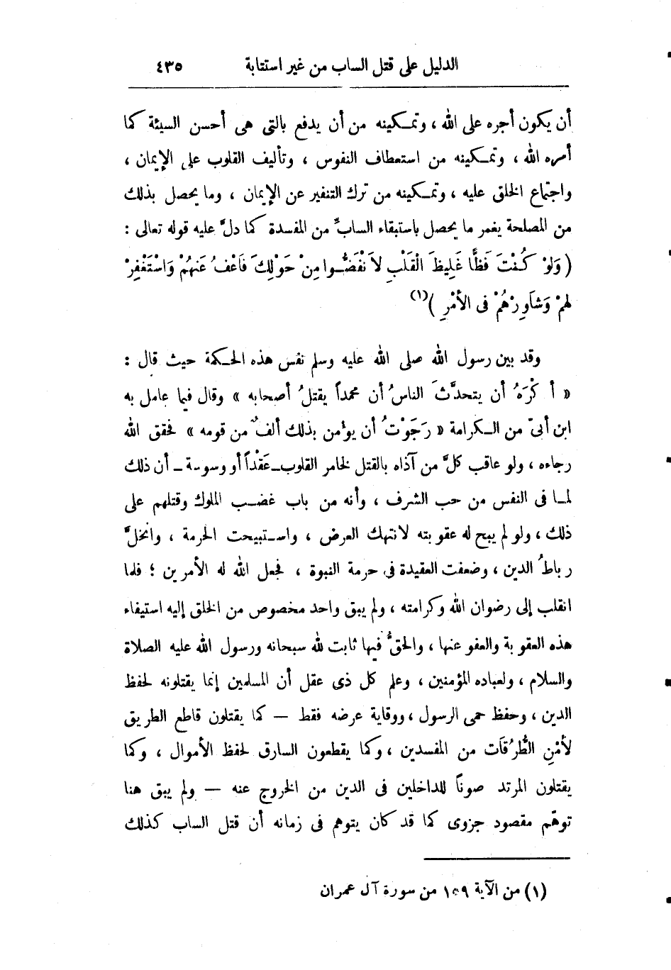 أن يكون أجره على الله وتمكينه من أن يدفع بالتي هي أحسن السيئة كما أمره الله وتمكينه من استعطاف النفوس وتأليف القلوب على الإيمان واجتماع الخلق عليه وتمكينه من ترك التنفير عن الإيمان وما يحصل بذلك من المصلحة يغمر ما يحصل باستبقاء الساب من المفسدة كما دل عليه قوله تعالى: {وَلَوْ كُنْتَ فَظّاً غَلِيظَ الْقَلْبِ لانْفَضُّوا مِنْ حَوْلِكَ فَاعْفُ عَنْهُمْ وَاسْتَغْفِرْ لَهُمْ وَشَاوِرْهُمْ فِي الأَمْرِ} .