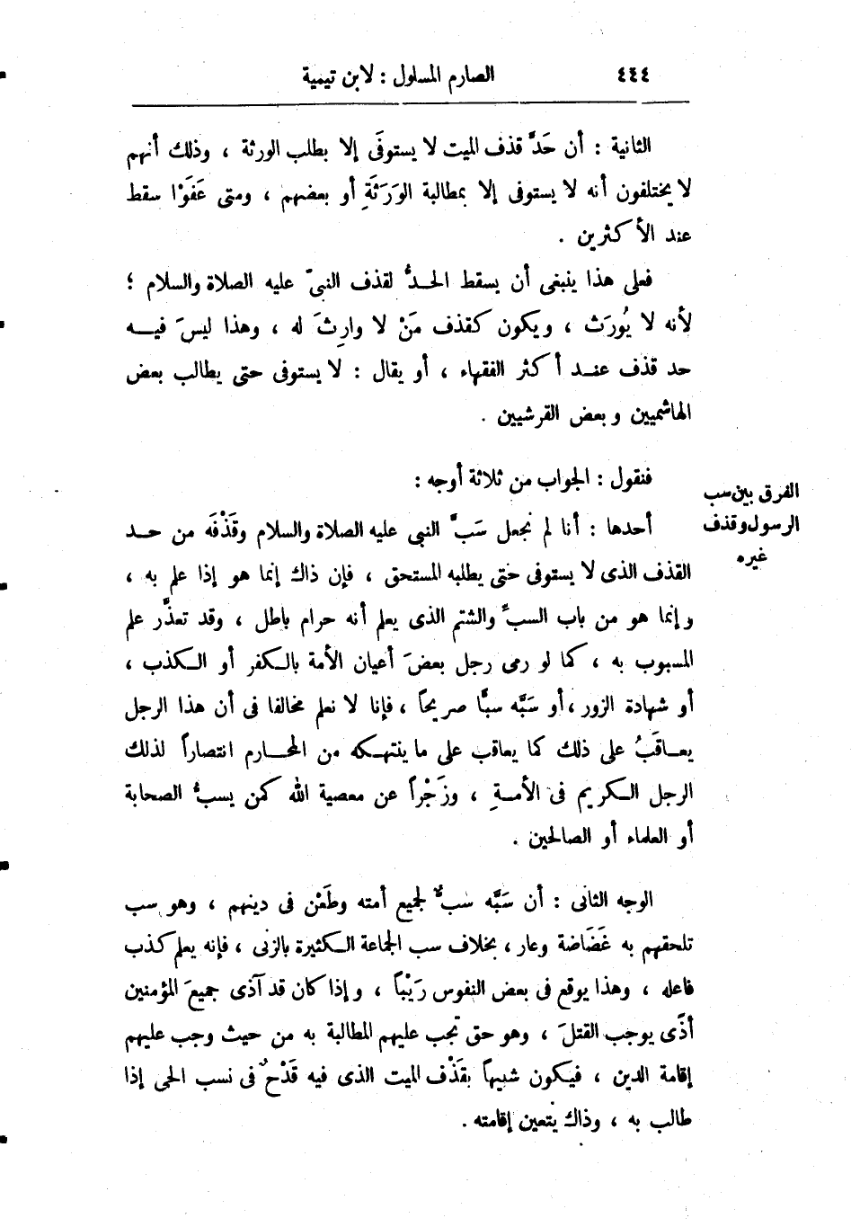 أحدها: أنا لم نجعل سب النبي صلى الله عليه وسلم وقذفه من حد القذف الذي لا يستوفى حتى يطلبه المستحق فإن ذاك إنما هو إذا علم به وإنما هو من باب السب والشتم الذي يعلم أنه حرام باطل وقد تعذر علم المسبوب به كما لو رمى رجل بعض أعيان الأمة بالكفر أو الكذب أو شهادة الزور أو سبه سبا صريحا فإنا لا نعلم مخالفا في أن هذا الرجل يعاقب على ذلك كما يعاقب على ما ينتهكه من المحارم انتصارا لذلك الرجل الكريم في الأمة وزجرا عن معصية الله كمن يسب الصحابة أو العلماء أو الصالحين.