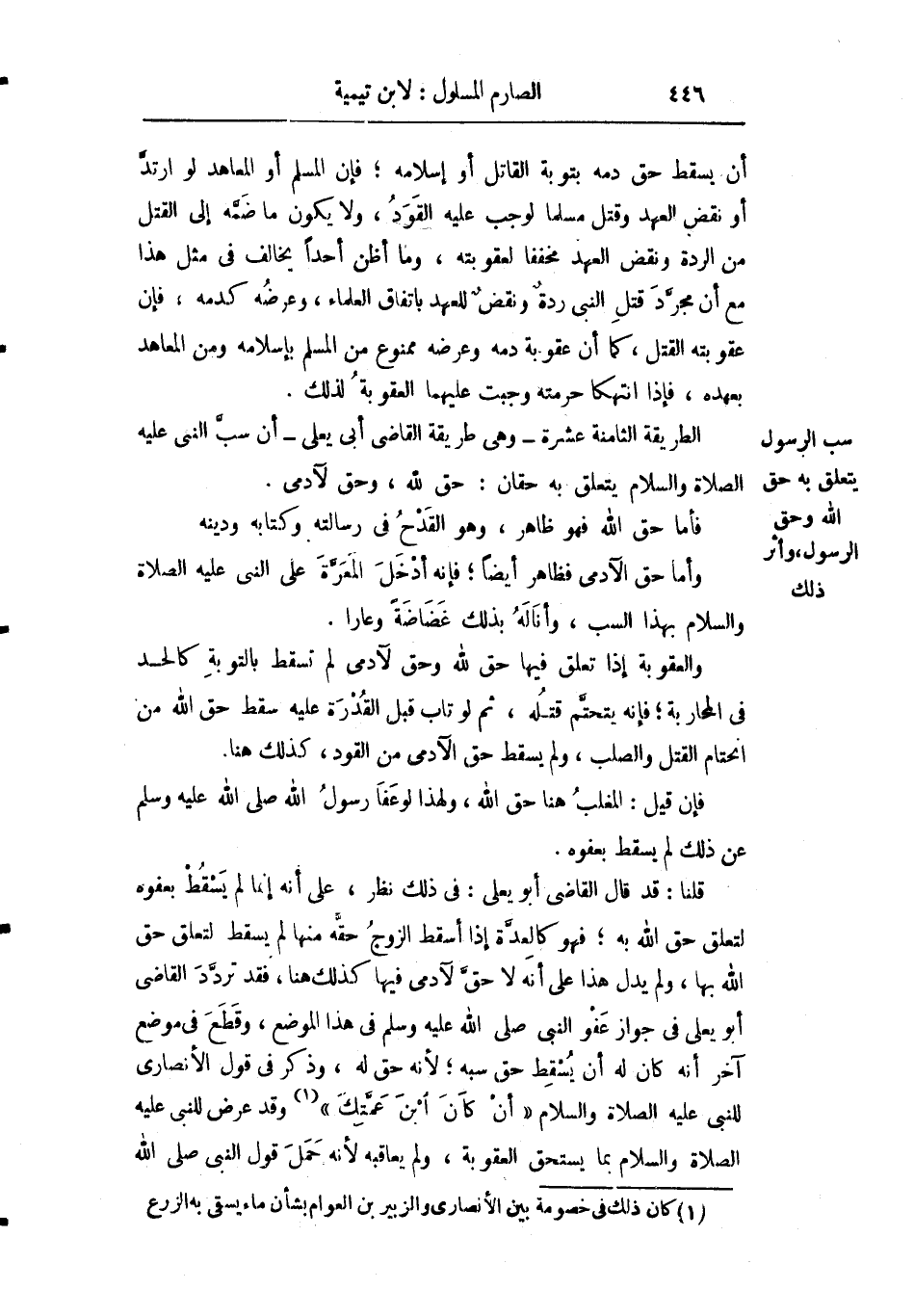 أن يسقط حق دمه بتوبة القاتل أو إسلامه فإن المسلم أو المعاهد لو ارتد أو نقض العهد وقتل مسلما لوجب عليه القود ولا يكون ما ضمه إلى القتل من الردة ونقض العهد مخففا لعقوبته وما أظن أحدا يخالف في مثل هذا مع أن مجرد قتل النبي ردة ونقض للعهد باتفاق العلماء وعرضه كدمه فإن عقوبته القتل كما أن عقوبة دمه وعرضه ممنوع من المسلم بإسلامه ومن المعاهد بعهده فإذا انتهكا حرمته وجبت عليهما العقوبة لذلك.