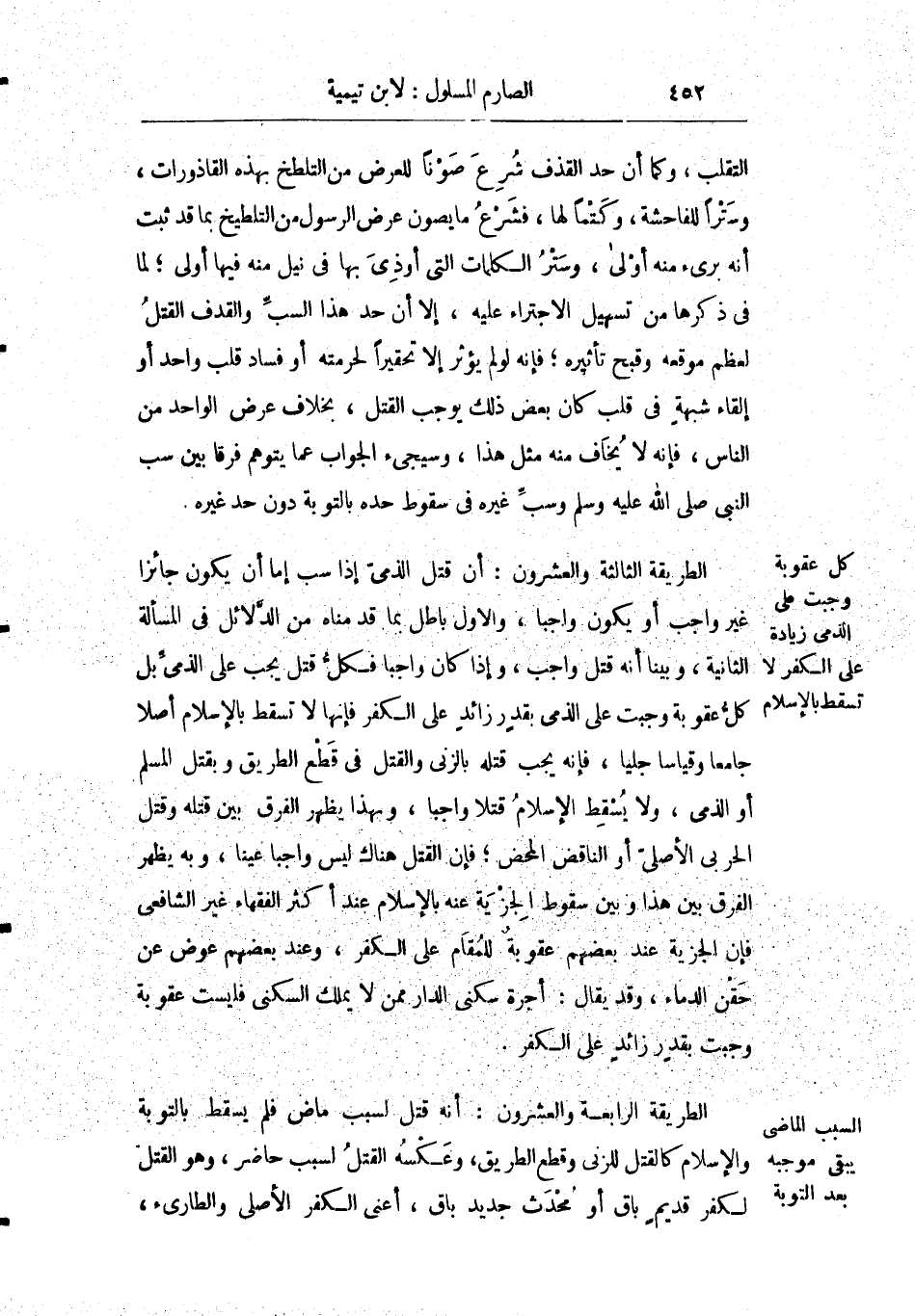 الطريقة الثالثة والعشرون: أن قتل الذمي إذا سب إما أن يكون جائزا غير واجب أو يكون واجبا والأول باطل بما قدمناه من الدلائل في المسألة الثانية وبينا أنه قتل واجب وإذا كان واجبا فكل قتل يجب على الذمي بل كل عقوبة وجبت على الذمي بقدر زائد على الكفر فإنها لا تسقط بالإسلام أصلا جامعا وقياسا جليا فإنه يجب قتله بالزنا والقتل في قطع الطريق وبقتل المسلم أو الذمي ولا يسقط الإسلام قتلا واجبا وبهذا يظهر الفرق بين قتله وقتل الحربي الأصلي أو الناقض المحض فإن القتل هناك ليس واجبا عينا وبه يظهر الفرق بين هذا وبين سقوط الجزية عنه بالإسلام عند أكثر الفقهاء غير الشافعي فإن الجزية عند بعضهم عقوبة للمقام على الكفر وعند بعضهم عوض عن حقن الدماء وقد يقال: أجرة سكنى الدار ممن لا يملك السكنى فليست عقوبة وجبت لقدر زائد على الكفر.