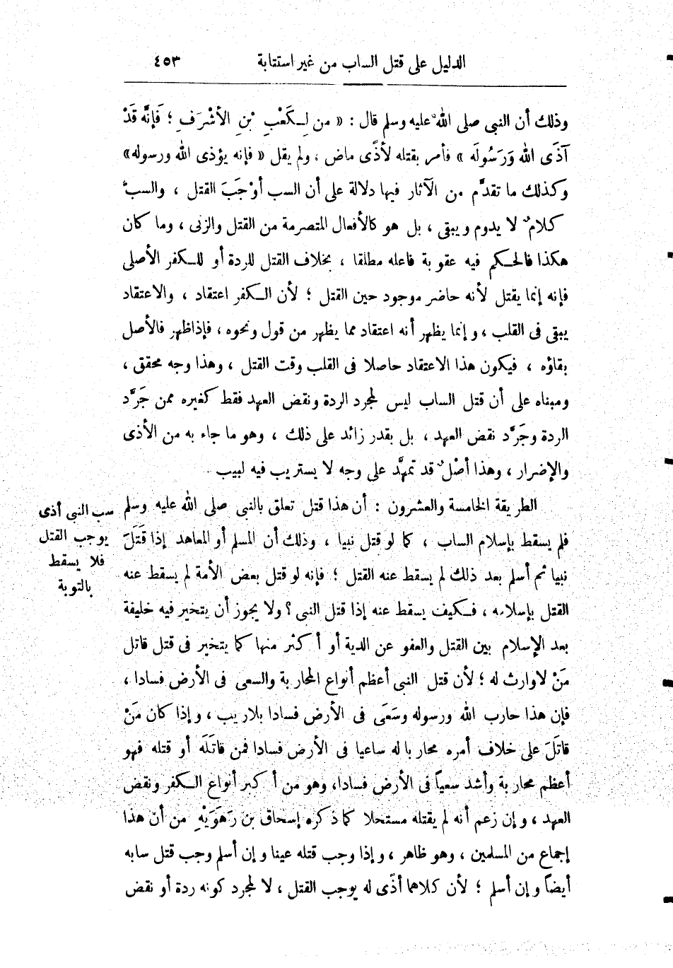 الطريقة الخامسة والعشرون: أن هذا قتل تعلق بالنبي صلى الله عليه وسلم فلم يسقط بإسلام الساب كما لو قتل نبيا وذلك أن المسلم أو المعاهد إذا قتل نبيا ثم أسلم بعد ذلك لم يسقط عنه القتل فإنه لو قتل بعض الأمة لم يسقط عنه القتل بإسلامه فكيف يسقط عنه إذا قتل النبي؟ ولا يجوز أن يتخير فيه خليفة بعد الإسلام بين القتل والعفو على الدية أو أكثر منها كما يتخير في قتل قاتل من لا وارث له لأن قتل النبي أعظم أنواع المحاربة والسعي في الأرض فسادا فإن هذا حارب الله ورسوله وسعى في الأرض فسادا بلا ريب وإذا كان من قاتل على خلاف أمره محاربا له ساعيا في الأرض فسادا فمن قاتله أو قتله فهو أعظم محاربة وأشد سعيا في الأرض فسادا وهو من أكبر أنواع الكفر ونقض العهد وإن زعم أنه لم يقتله مستحلا كما ذكره إسحاق بن راهويه من أن هذا إجماع من المسلمين وهو ظاهر وإذا وجب قتله عينا وإن أسلم وجب قتل سابه أيضا وإن أسلم لأن كلاهما أذى له يوجب القتل لا لمجرد كونه ردة أو نقض