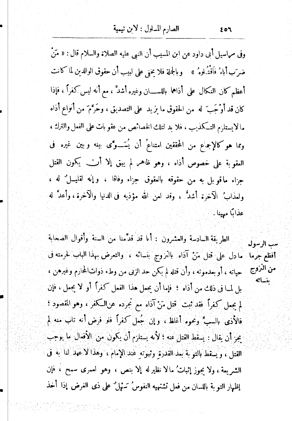 الطريقة السادسة والعشرون: أنا قد قدمنا من السنة وأقوال الصحابة ما دل على قتل من آذاه بالتزوج بنسائه والتعرض بهذا الباب لحرمته في حياته أو بعد موته وأن قتله لم يكن حد الزنا من وطء ذوات المحارم وغيرهن بل لما في ذلك من أذاه فإما أن يجعل هذا الفعل كفرا أو لا يجعل فإن لم يجعل كفرا فقد ثبت قتل من آذاه مع تجرده عن الكفر وهو المقصود فالأذى بالسب ونحوه أغلظ وإن جعل كفرا فلو فرض أنه تاب منه لم يجز أن يقال: يسقط القتل عنه لأنه يستلزم أن يكون من الأفعال ما يوجب القتل ويسقط بالتوبة بعد القدرة وثبوته عند الإمام وهذا لا عهد لنا به في الشريعة ولا يجوز إثبات مالا نضير له إلا بنص وهو لعمري سمح فإن إظهار التوبة باللسان من فعل تشتهيه النفوس سهل على ذي الغرض إذا أخذ