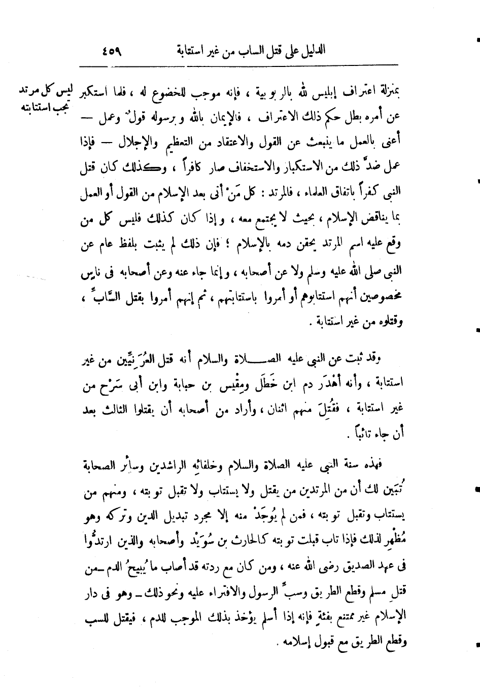 وقد ثبت عن النبي صلى الله عليه وسلم أنه قتل العرنيين من غير استتابة وأنه أهدر دم ابن خطل ومقيس بن حبابة وابن أبي سرح من غير استتابة فقتل منهم اثنان وأراد من أصحابه أن يقتلوا الثالث بعد أن جاء تائبا.