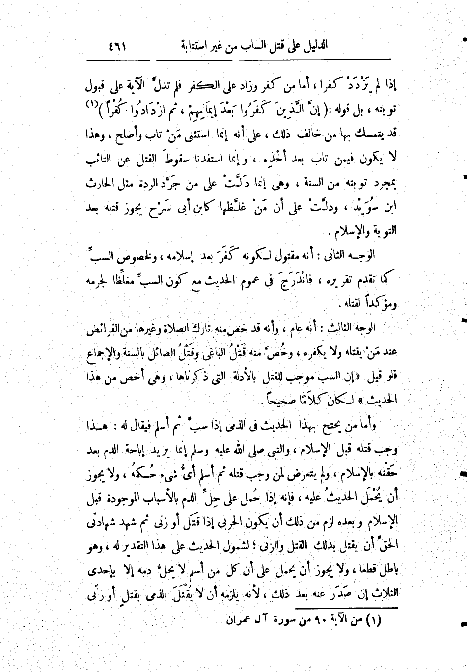وأما من يحتج بهذا الحديث في الذمي إذا سب ثم أسلم فيقال له: هذا وجب قتله قبل الإسلام والنبي صلى الله عليه وسلم إنما يريد إباحة الدم بعد حقنه بالإسلام ولم يتعرض لمن وجب قتله ثم أسلم أي شيء حكمه ولا يجوز أن يحمل الحديث عليه فإنه إذا حمل على حل الدم بالأسباب الموجودة قبل الإسلام وبعده لزم من ذلك أن يكون الحربي إذا قتل أو زنى ثم شهد شهادتي الحق أن يقتل بذلك القتل والزنى لشمول الحديث على هذا التقدير له وهو باطل قطعا ولا يجوز أن يحمل على أن كل من أسلم لا يحل دمه إلا بإحدى الثلاث إن صدر عنه بعد ذلك لأنه يلزمه أن لا يقتل الذمي لقتل أو زنى