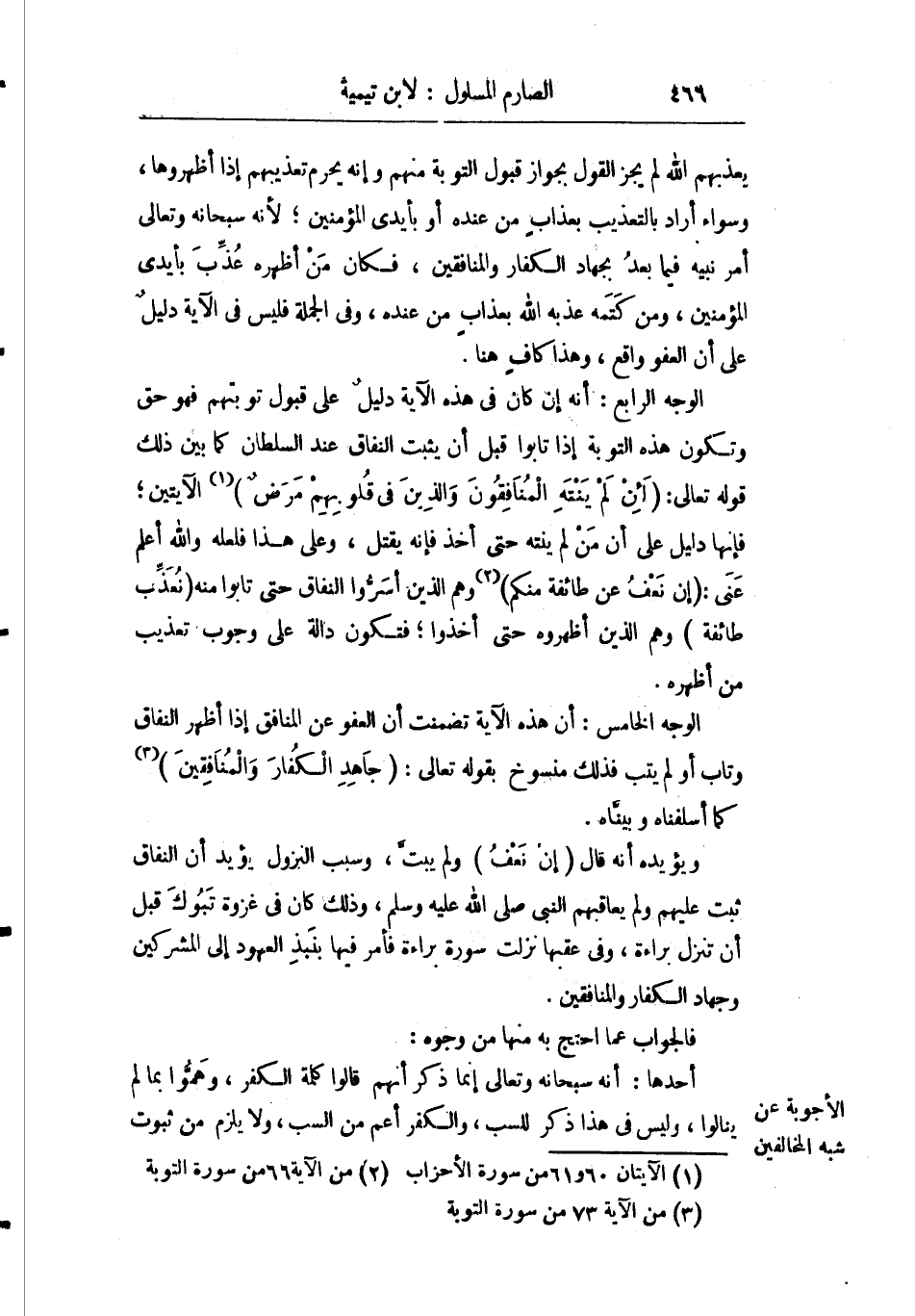 الوجه الرابع: أنه إن كان في هذه الآية دليل على قبول توبتهم فهو حق وتكون هذه التوبة إذا تابوا قبل أن يثبت النفاق عند السلطان كما بين ذلك قوله تعالى: {لَئِنْ لَمْ يَنْتَهِ الْمُنَافِقُونَ وَالَّذِينَ فِي قُلُوبِهِمْ مَرَضٌ} الآيتين فإنها دليل على أن من لم ينته حتى أخذ فإنه يقتل وعلى هذا فلعله والله أعلم عنى: {إِنْ نَعْفُ عَنْ طَائِفَةٍ مِنْكُمْ} وهم الذين أسروا النفاق حتى تابوا منه: {نُعَذِّبْ طَائِفَة} وهم الذين أظهروه حتى أخذوا فتكون دالة على وجوب تعذيب من أظهره.