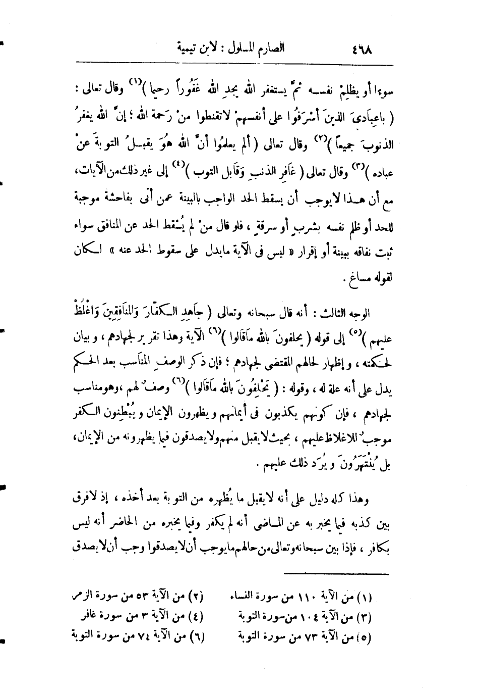 سُوءاً أَوْ يَظْلِمْ نَفْسَهُ ثُمَّ يَسْتَغْفِرِ اللَّهَ يَجِدِ اللَّهَ غَفُوراً رَحِيماً} وقال تعالى: {يَا عِبَادِيَ الَّذِينَ أَسْرَفُوا عَلَى أَنْفُسِهِمْ لا تَقْنَطُوا مِنْ رَحْمَةِ اللَّهِ إِنَّ اللَّهَ يَغْفِرُ الذُّنُوبَ جَمِيعاً} وقال تعالى: {أَلَمْ يَعْلَمُوا أَنَّ اللَّهَ هُوَ يَقْبَلُ التَّوْبَةَ عَنْ عِبَادِهِ} وقال تعالى: {غَافِرِ الذَّنْبِ وَقَابِلِ التَّوْبِ} إلى غير ذلك من الآيات مع أن هذا لا يوجب أن يسقط الحد الواجب بالبينة عمن أتى فاحشة موجبة للحد أو ظلم نفسه بشرب أو سرقة فلو قال من لم يسقط الحد عن المنافق سواء ثبت نفاقه ببينه أو إقرار "ليس في الآية ما يدل على سقوط الحد عنه" لكان لقوله مساغ.