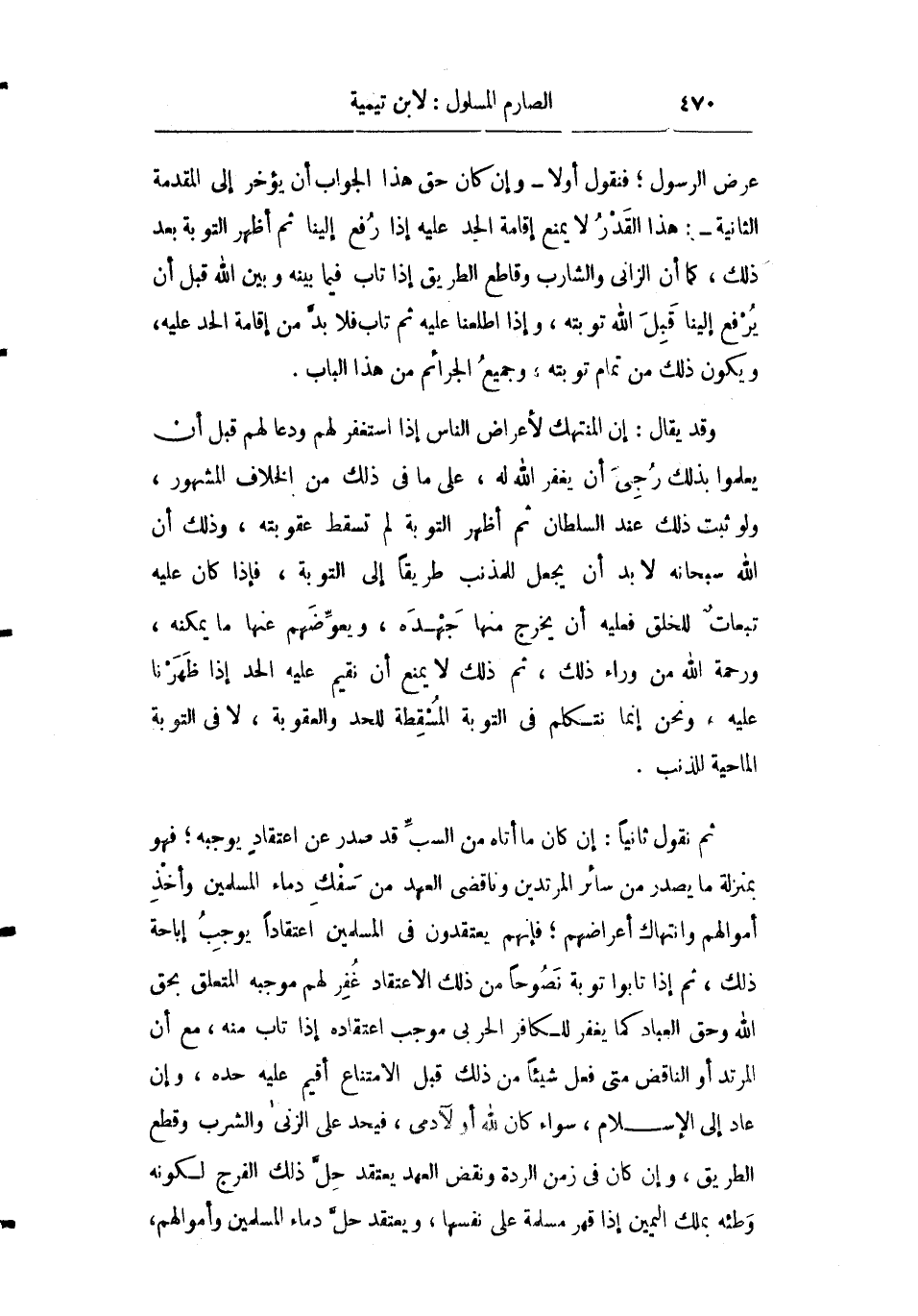ثم نقول ثانيا: إن كان ما أتاه من السب قد صدر عن اعتقاد يوجبه فهو بمنزلة ما يصدر من سائر المرتدين وناقضي العهد من سفك دماء المسلمين وأخذ أموالهم وانتهاك أعراضهم فإنهم يعتقدون في المسلمين اعتقادا يوجب إباحة ذلك ثم إذا تابوا توبة نصوحا من ذلك الاعتقاد غفر لهم موجبه المتعلق بحق الله وحق العباد كما يغفر للكافر الحربي موجب اعتقاده إذا تاب منه مع أن المرتد أو الناقض متى فعل شيئا من ذلك قبل الامتناع أقيم عليه حده وإن عاد إلى الإسلام سواء كان لله أو لآدمي فيحد على الزنا والشرب وقطع الطريق وإن كان في زمن الردة ونقض العهد يعتقد حل ذلك الفرج لكونه وطئه بملك اليمين إذا قهر مسلمة على نفسها ويعتقد حل دماء المسلمين وأموالهم