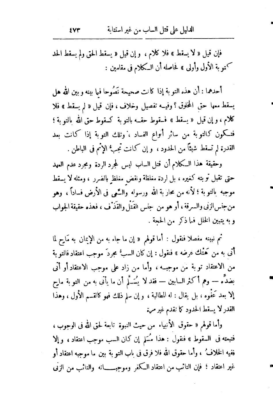 ثم نبينه مفصلا فنقول: أما قولهم: "إن ما جاء به من الإيمان به ماح لما أتى به من هتك عرضه" فنقول: إن كان السب مجرد موجب اعتقاد فالتوبة من الاعتقاد توبة من موجبه وأما من زاد على موجب الاعتقاد أو أتى بضده وهم أكثر السابين فقد لا يسلم أن ما يأتي به من التوبة ماح إلا بعد عفوه بل يقال: له المطالبة وإن سلم ذلك فهو كالقسم الأول وهذا القدر لا يسقط الحدود كما تقدم غير مرة.