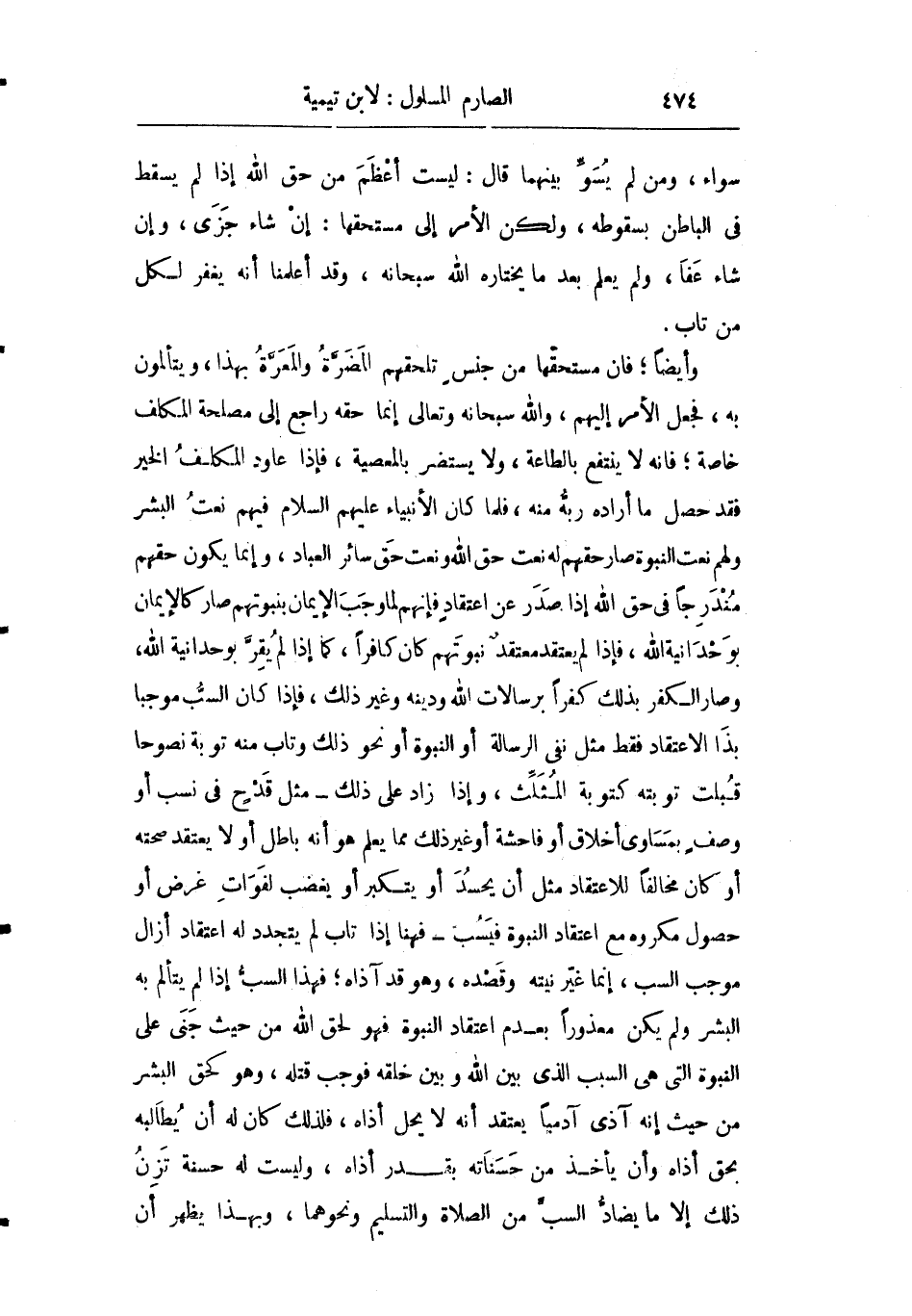 وأيضا فإن مستحقها من جنس تلحقهم المضرة والمعرة بهذا ويتألمون به فجعل الأمر إليهم والله سبحانه وتعالى إنما حقه راجع إلى مصلحة المكلف خاصة فإنه لا ينتفع بالطاعة ولا يستضر بالمعصية فإذا عاود المكلف الخير فقد حصل ما أراده ربه منه فلما كان الأنبياء عليهم السلام فيهم نعت البشر ولهم نعت النبوة صار حقهم له نعت حق الله ونعت حق سائر العباد وإنما يكون حقهم مندرجا في حق الله إذا صدر عن اعتقاد فإنهم لما وجب الإيمان بنبوتهم صار كالإيمان بوحدانية الله فإذا لم يعتقد معتقد نبوتهم كان كافرا كما إذا لم يقر بوحدانية الله وصار الكفر بذلك كفرا برسالات الله ودينه وغير ذلك فإذا كان السب موجبا بذا الاعتقاد فقط مثل نفي الرسالة أو النبوة ونحو ذلك وتاب منه توبة نصوحا قبلت توبته كتوبة المثلث وإذا زاد على ذلك مثل قدح في نسب أو وصف لمساوي الأخلاق أو فاحشة أو غير ذلك مما يعلم هو أنه باطل أو لا يعتقد صحته أو كان مخالفا للاعتقاد مثل أن يحسد أو يتكبر أو يغضب لفوات غرض أو حصول مكروه مع اعتقاد النبوة فيسب فهنا إذا تاب لم يتجدد له اعتقاد أزال موجب السب إنما غير نيته وقصده وهو قد آذاه فهذا السب إذا يتألم به البشر ولم يكن معذورا بعدم اعتقاد النبوة فهو لحق الله من حيث جنى على النبوة التي هي السبب الذي بين الله وبين خلقه فوجب قتله وهو كحق البشر من حيث أنه آذى آدميا يعتقد أنه لا يحل أذاه فلذلك كان له أن يطالبه بحق أذاه وأن يأخذ من حسناته بقدر أذاه وليست له حسنة تزن ذلك إلا ما يضاد السب من الصلاة والتسليم ونحوهما وبهذا يظهر أن