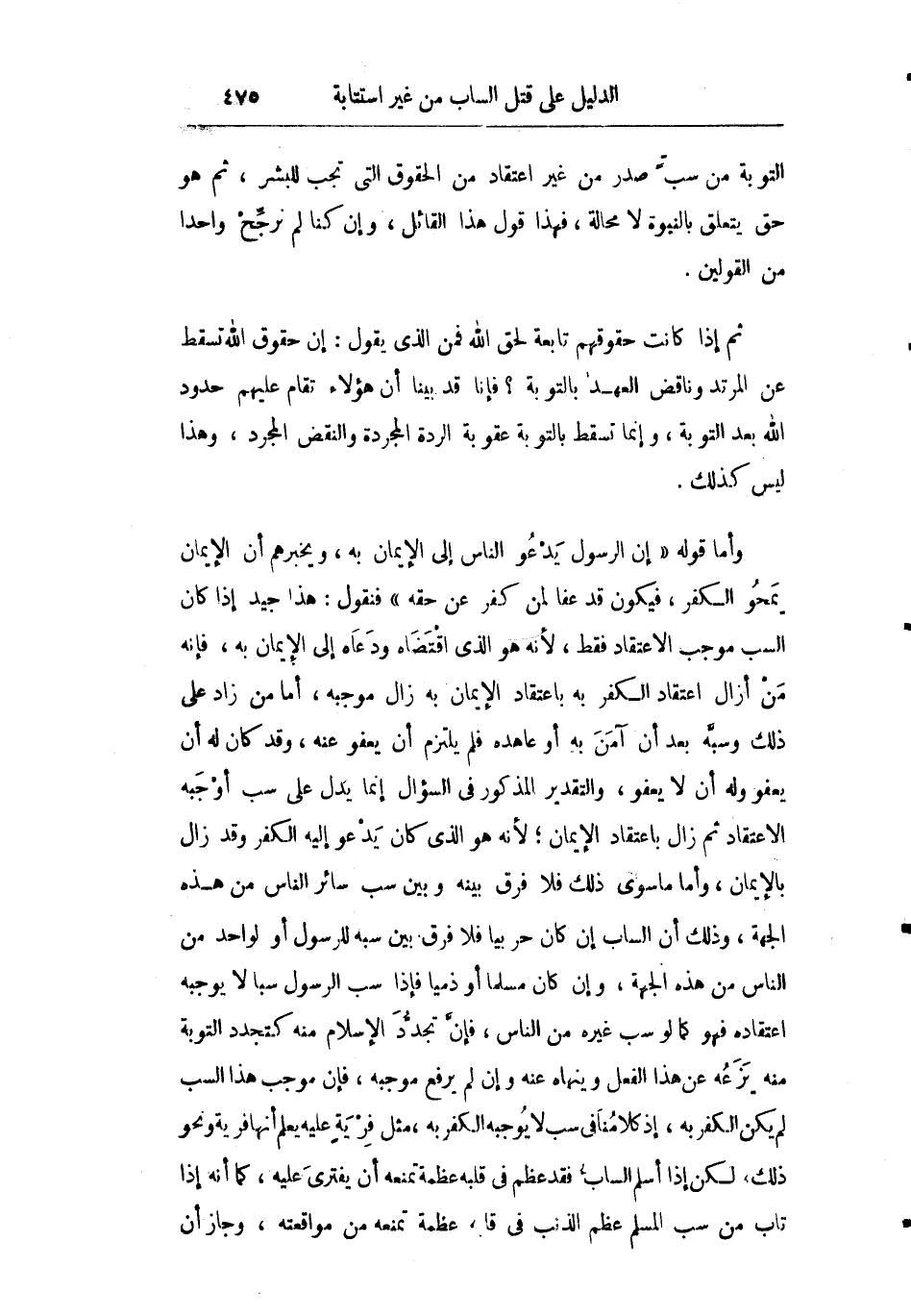 التوبة من سب صدر من غير اعتقاد من الحقوق التي تجب للبشر ثم هو حق متعلق بالنبوة لا محالة فهذا قول هذا القائل وإن كنا لم نرجح واحدا من القولين.