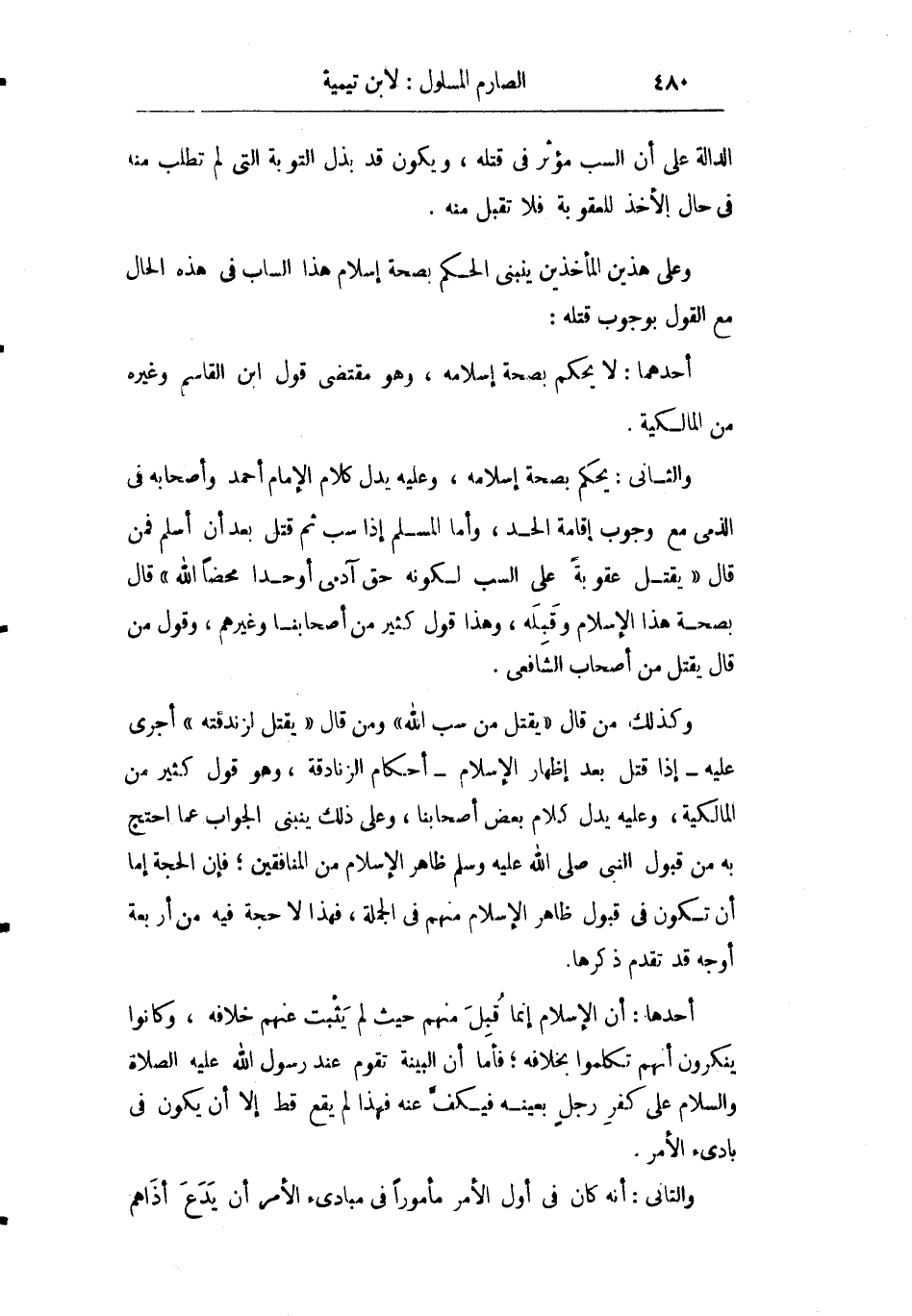 والثاني: يحكم بصحة إسلامه وعليه يدل كلام الإمام أحمد وأصحابه في الذمي مع وجوب إقامة الحد وأما المسلم إذا سب ثم قتل بعد أن أسلم فمن قال: "يقتل عقوبة على السب لكونه حق آدمي أو حدا محضا لله" قال بصحة هذا الإسلام وقبله وهذا قول كثير من أصحابنا وغيرهم وهو قول من قال يقتل من أصحاب الشافعي.