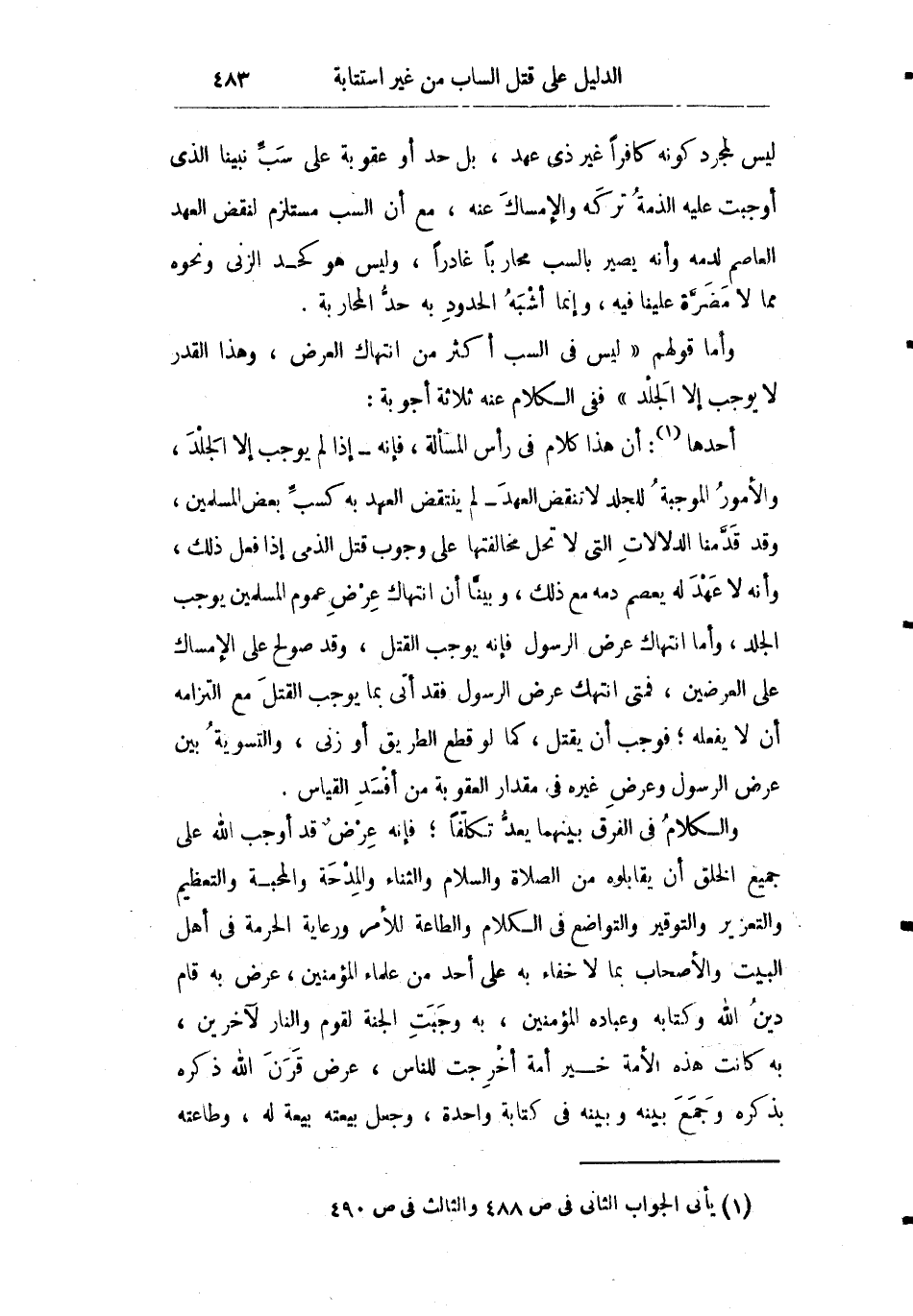 وأما قولهم "ليس في السب أكثر من انتهاك العرض وهذا القدر لا يوجب إلا الجلد" ففي الكلام عنه ثلاثة أجوبة: