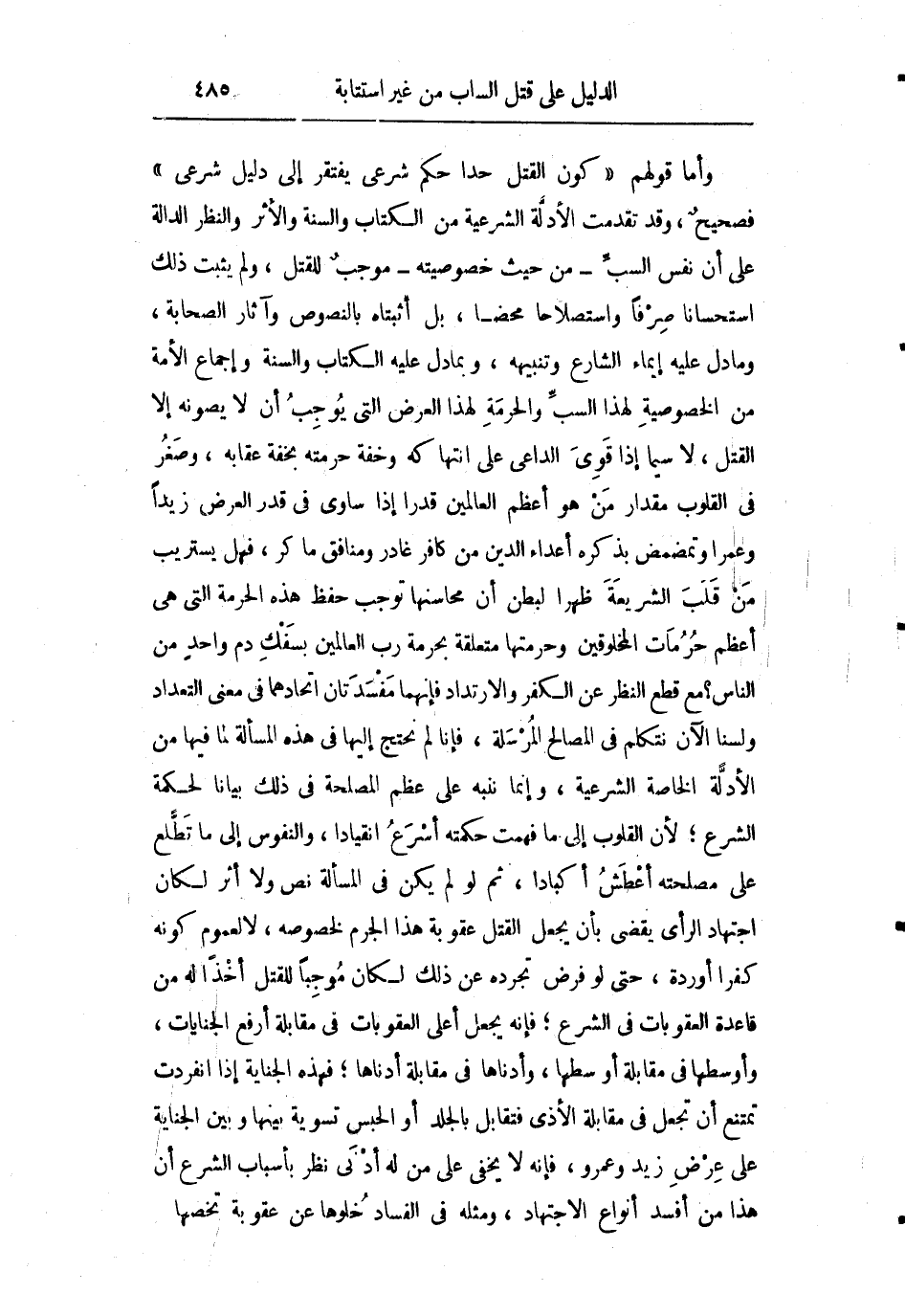 وأما قولهم: "كون القتل حدا حكم شرعي يفتقر إلى دليل شرعي" فصحيح وقد تقدمت الأدلة الشرعية من الكتاب والسنة والأثر والنظر الدالة على أن نفس السب من حيث خصوصيته موجب للقتل ولم يثبت ذلك استحسانا صرفا واستصلاحا محضا بل أثبتناه بالنصوص وآثار الصحابة وما دل عليه إيماء الشارع وتنبيهه وبما دل عليه الكتاب والسنة وإجماع الأمة من الخصوصية لهذا السب والحرمة لهذا العرض التي يوجب أن لا يصونه إلا القتل لا سيما إذا قوي الداعي على انتهاكه وخفة حرمته بخفة عقابه وصغر في القلوب مقدار من هو أعظم العالمين قدرا إذا ساوى في قدر العرض زيدا وعمروا وتمضمض بذكره أعداء الدين من كافر غادر ومنافق ماكر فهل يستريب من قلب الشريعة ظهرا لبطن أن محاسنها توجب حفظ هذه الحرمة التي هي أعظم حرمات المخلوقين وحرمتها متعلقة بحرمة رب العالمين بسفك دم واحد من الناس؟ مع قطع النظر عن الكفر والارتداد فإنهما مفسدتان اتحادهما في معنى التعداد ولسنا الآن نتكلم في المصالح المرسلة فإنا لم نحتج إليها في هذه المسألة لما فيها من الأدلة الخاصة الشرعية وإنما ننبه على عظم المصلحة في ذلك بيانا لحكمة الشرع لأن القلوب إلى ما فهمت حكمته أسرع انقيادا والنفوس إذا ما تطلع على مصلحته أعطش أكبادا ثم لو لم يكن في المسألة نص ولا أثر لكان اجتهاد الرأي يقضي بأن يجعل القتل عقوبة هذا الجرم لخصوصه لا لعموم كونه كفرا أو ردة حتى لو فرض تجرده عن ذلك لكان موجبا للقتل أخذا له من قاعدة العقوبات في الشرع فإنه يجعل أعلى العقوبات في مقابلة أرفع الجنايات وأوسطها في مقابلة أوسطها وأدناها في مقابلة أدناها فهذه الجناية إذا انفردت تمتنع أن تجعل في مقابلة الأذى فتقابل بالجلد أو الحبس تسوية بينها وبين الجناية على عرض زيد وعمرو فإنه لا يخفى على من له أدنى نظر بأسباب الشرع أن هذا من أفسد أنواع الاجتهاد ومثله في الفساد خلوها من عقوبة تخصها