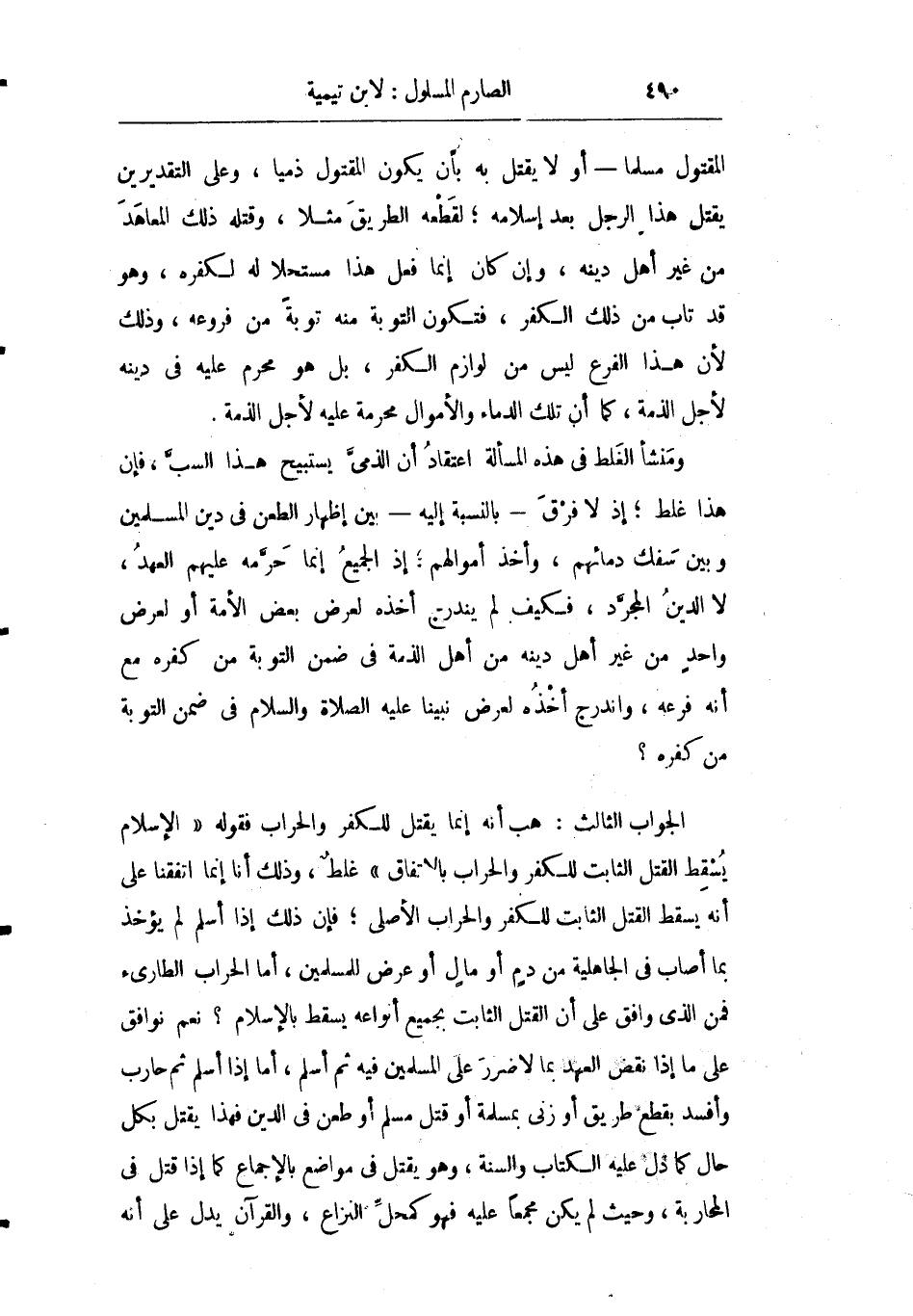 الجواب الثالث: هب أنه إنما يقتل للكفر والحراب فقوله: "الإسلام يسقط القتل الثابت للكفر والحراب بالاتفاق" غلط وذلك أنا إنما اتفقنا على أنه يسقط القتل الثابت للكفر والحراب الأصلي فإن ذلك إذا أسلم لم يؤخذ بما أصاب في الجاهلية من دم أو مال أو عرض للمسلمين أما الحراب الطارىء فمن الذي وافق على أن القتل الثابت بجميع أنواعه يسقط بالإسلام؟ نعم نوافق على ما إذا نقض العهد بما لا ضرر على المسلمين فيه ثم أسلم أما إذا أسلم ثم حارب وأفسد بقطع طريق أو زنى بمسلمة أو قتل مسلم أو طعن في الدين فهذا يقتل بكل حال كما دل عليه الكتاب والسنة وهو يقتل في مواضع بالإجماع كما إذا قتل في المحاربة وحيث لم يكن مجمعا عليه فهو كمحل النزاع والقرآن يدل على أنه